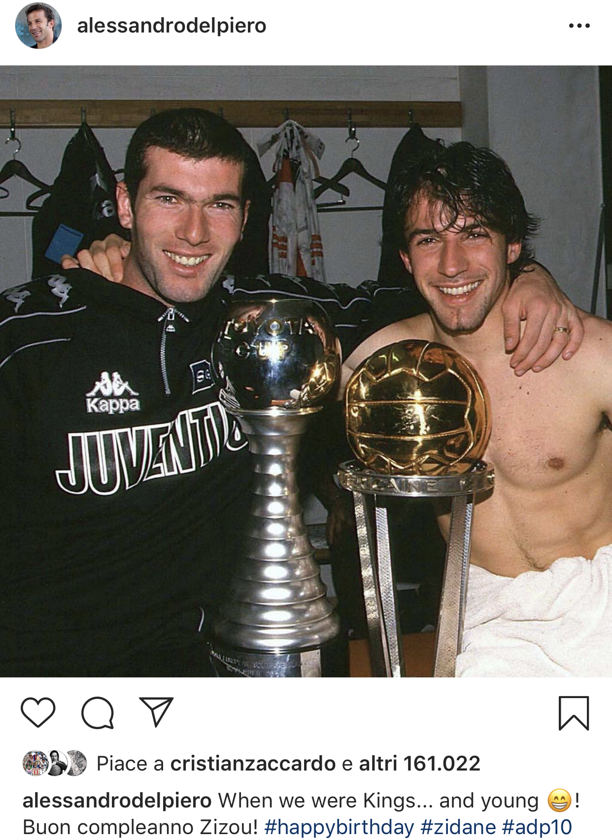 “Pinturucchio” ha postato una delle più famosi foto scattate ai due negli spogliatoi di Tokyo al termine della finale vinta il 26 Novembre 1996 quando i bianconeri hanno sconfitto di misura il River Plate proprio grazie ad una rete messa a segno dal numero 10 bianconero. I due posano sorridenti dietro alla Coppa Intercontinentale e alla Coppa del Miglior giocatore conquistata da Del Piero che ha scritto: “When we were Kings and Young. Buon compleanno Zizou” che tradotto vuole dire: “Quando eravamo re e giovani”. Il ricordo pubblicato dall’ex bandiera bianconera ha scatenato i fans che si sono rituffati a quella stagione quando la Juve raggiunse il tetto del mondo.