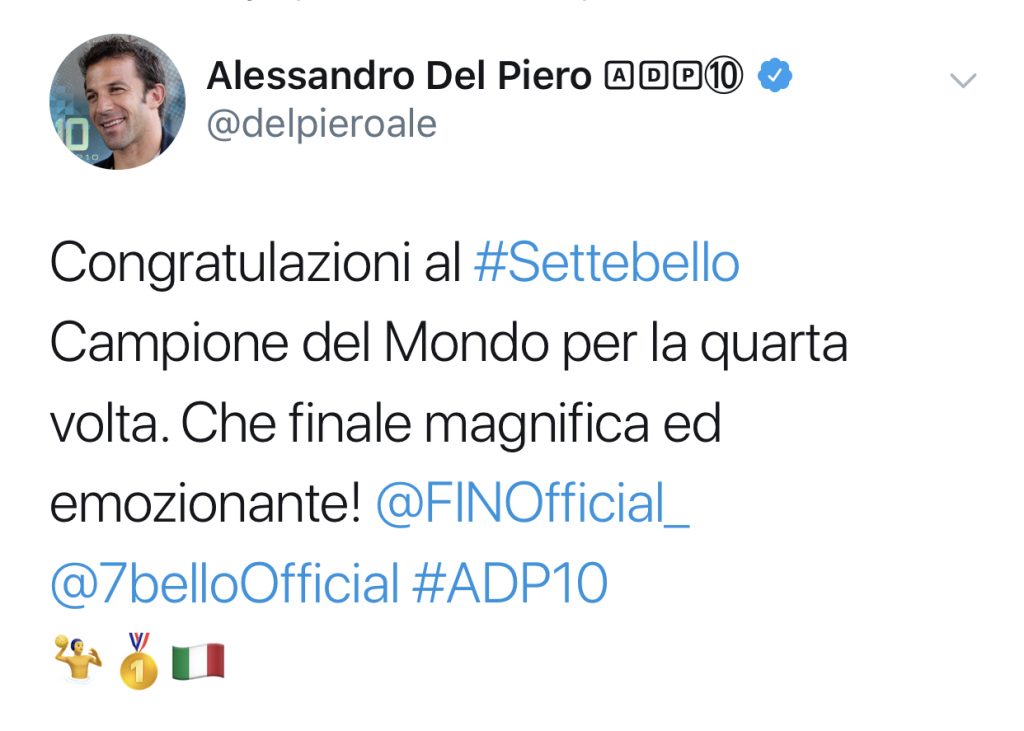 Il Settebello guidato dal ct Alessandro Campagna è riuscito così nell’impresa di conquistare il quarto mondiale azzurro. L’impresa non è naturalmente passata inosservata e, tra i tanti elogi, spicca quello di un ex leggenda bianconera, Alessandro Del Piero che ha voluto complimentarsi con la squadra tramite il proprio profilo di Twitter dove ha scritto: “Congratulazioni al Settebello Campione del Mondo per la quarta volta. Che finale magnifica ed emozionante!”.