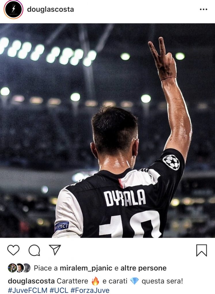 TORINO – Douglas Costa sta recuperando da un infortunio accusato ormai oltre un mese fa ma non è ancora tornato a disposizione di mister Sarri. Il brasiliano questa sera ha voluto condividere la gioia del successo conquistato dai suoi compagni contro il Lokomotiv postando sul proprio profilo di Instagram una foto del protagonista assoluto di questa serata, Paulo Dybala che con due reti ha regalato la vittoria alla squadra bianconera. Il mancino ha commentato la foto del numero 10 argentino con un emblematica frase: “Carattere e carati questa sera” facendo così riferimento alla determinazione e alla classe dei bianconeri ed in particolare della Joya argentina.