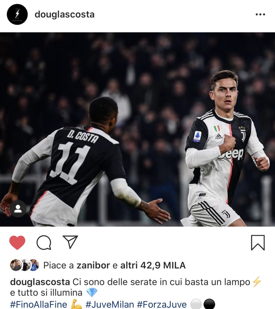 Il brasiliano, pochi minuti dopo la conclusione del match, ha celebrato su Instagram il gol postando una foto dell’esultanza della rete messa a segno da Dybala commentandola in questo modo: “Ci sono delle serate in cui basta un lampo (chiaro riferimento allo stesso Douglas Costa) e tutto si illumina”, inserendo un lampo ed un diamante che rappresentano i due giocatori protagonisti dell’azione che ha deciso l’incontro contro i rossoneri.