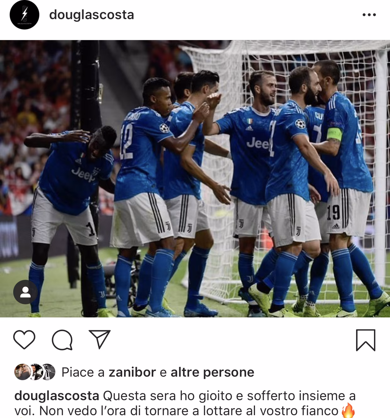 Il brasiliano difatti a causa di un infortunio accusato Sabato scorso al Franchi di Firenze, non è stato nemmeno convocato da Mister Sarri che è stato costretto a rinunciare alla sua velocità. Il mancino, non appena terminato l’incontro ha però voluto dimostrare la sua vicinanza ai compagni di squadra postando una foto dell’esultanza dopo il raddoppio firmato da Matuidi che ha commentato in questo modo: “Questa sera ho gioito e sofferto insieme a voi. Non vedo l’ora di tornare a lottare al vostro fianco”.