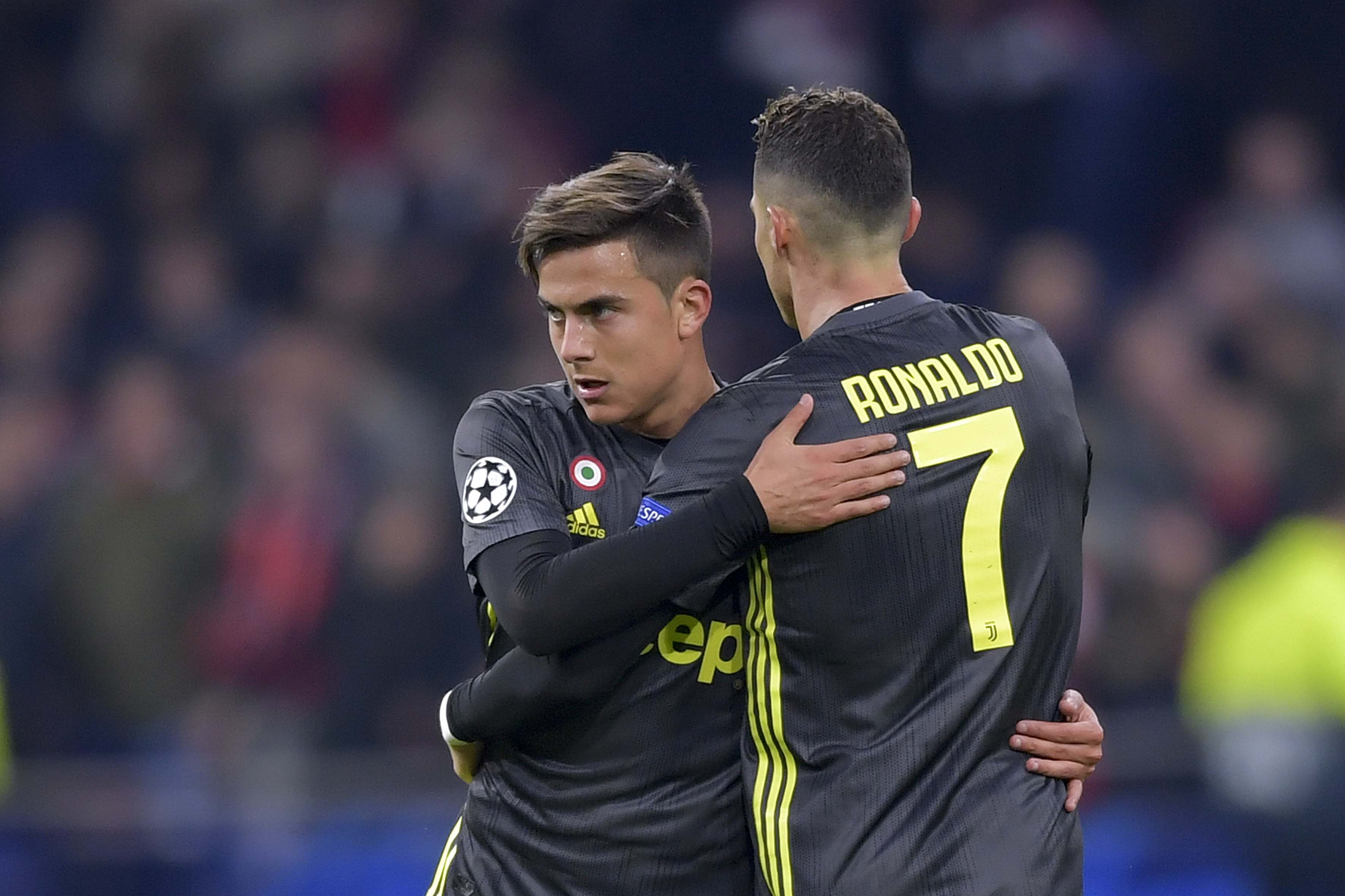 AMSTERDAM, NETHERLANDS - APRIL 10: Cristiano Ronaldo of Juventus hugs his teammate Paulo Dybala at the end of the UEFA Champions League Quarter Final first leg match between Ajax and Juventus at Johan Cruyff Arena on April 10, 2019 in Amsterdam, Netherlands. (Photo by Daniele Badolato - Juventus FC/Juventus FC via Getty Images)