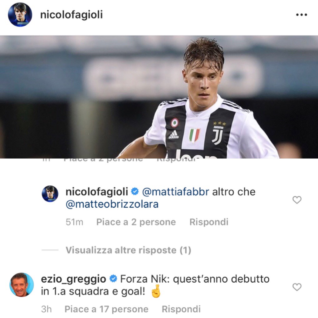 Tra i tanti commenti che hanno seguito il post, salta agli occhi quello di Ezio Greggio, noto presentatore televisivo e fan della Vecchia Signora che ha commentato in questo modo la foto del giovane centrocampista: “Forza Nik: quest’anno debutto in 1.a squadra e goal!”. Un bell’augurio a Fagioli che ha risposto con un semplice “Un sogno!” sperando che l’auspicio della stella televisiva si tramuti in realtà.