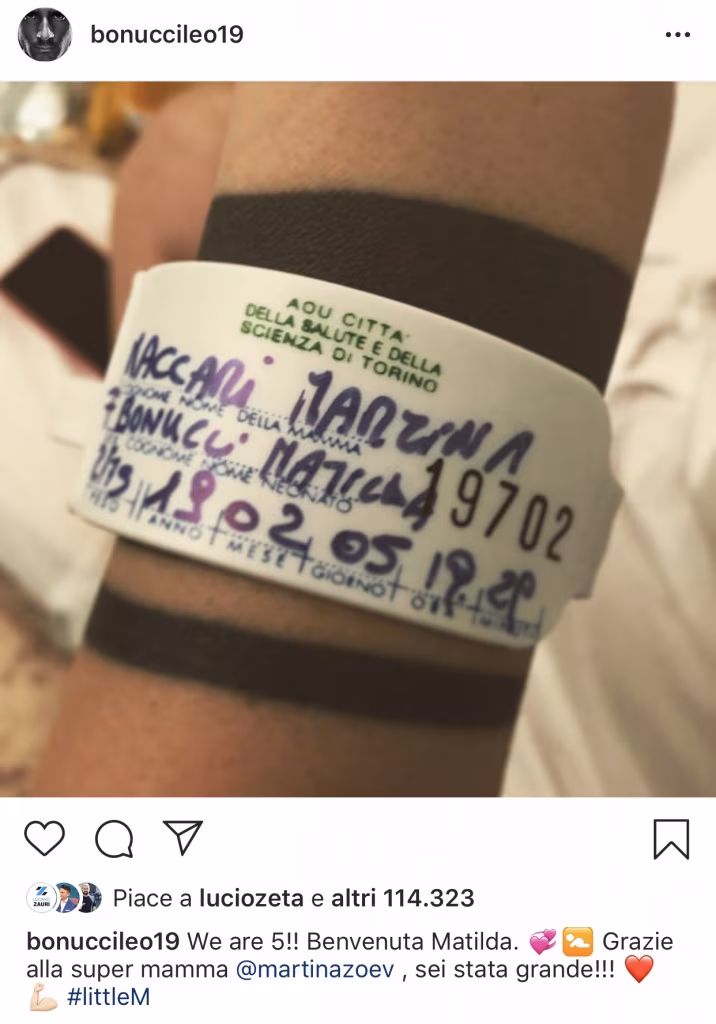 Leonardo Bonucci è diventato padre per la terza volta qualche ora fa, esattamente alle 19:29 quando la moglie Martina Maccari ha dato alla luce la piccola Matilda. Il difensore ha da poco condiviso la sua gioia coi suoi follower di Instagram dove ha postato una foto del polso della moglie col braccialetto riportante i dati della piccola Matilda. Bonucci ha commentato la foto scrivendo: “We are 5!! Benvenuta Matilda. Grazie alla super mamma Martina Maccari, sei stata grande!!”. Tra le migliaia di commenti al post, spiccano quelli degli ex compagni di squadra Marchisio, Morata, Matri, Marrone, Borriello e Coman ma anche di nazionale come Immobile e Eder. La piccola è la terzogenita della coppia, genitori già dei piccoli Lorenzo e Matteo. Ma intanto proprio in queste ore è arrivata un’enorme bomba di mercato che potrebbe stravolgere tutto: tifosi a bocca aperta, la notizia è veramente clamorosa! >>>LEGGI QUI