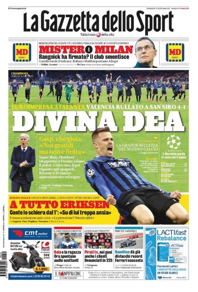 TORINO- È l’Atalanta l’argomento principale sulla prima pagina della Gazzetta dello Sport in edicola oggi. “Divina Dea” titola la rosea, che dà grande risalto al successo per 4-1 della squadra di Gasperini ai danni di un Valencia mai veramente in partita. Spazio anche per le due milanesi, con il Milan che smentisce l’ingaggio di Rangnick come allenatore della prossima stagione e le parole di Conte in conferenza, anche riguardo la situazione Eriksen. Ma attenzione perché, sempre in queste ultime ore, è arrivato anche un clamoroso annuncio di mercato. Colpo di scena incredibile, Paolo Paganini spiazza tutti: “Mi è arrivato uno spiffero…” >>>VAI ALLA NOTIZIA
