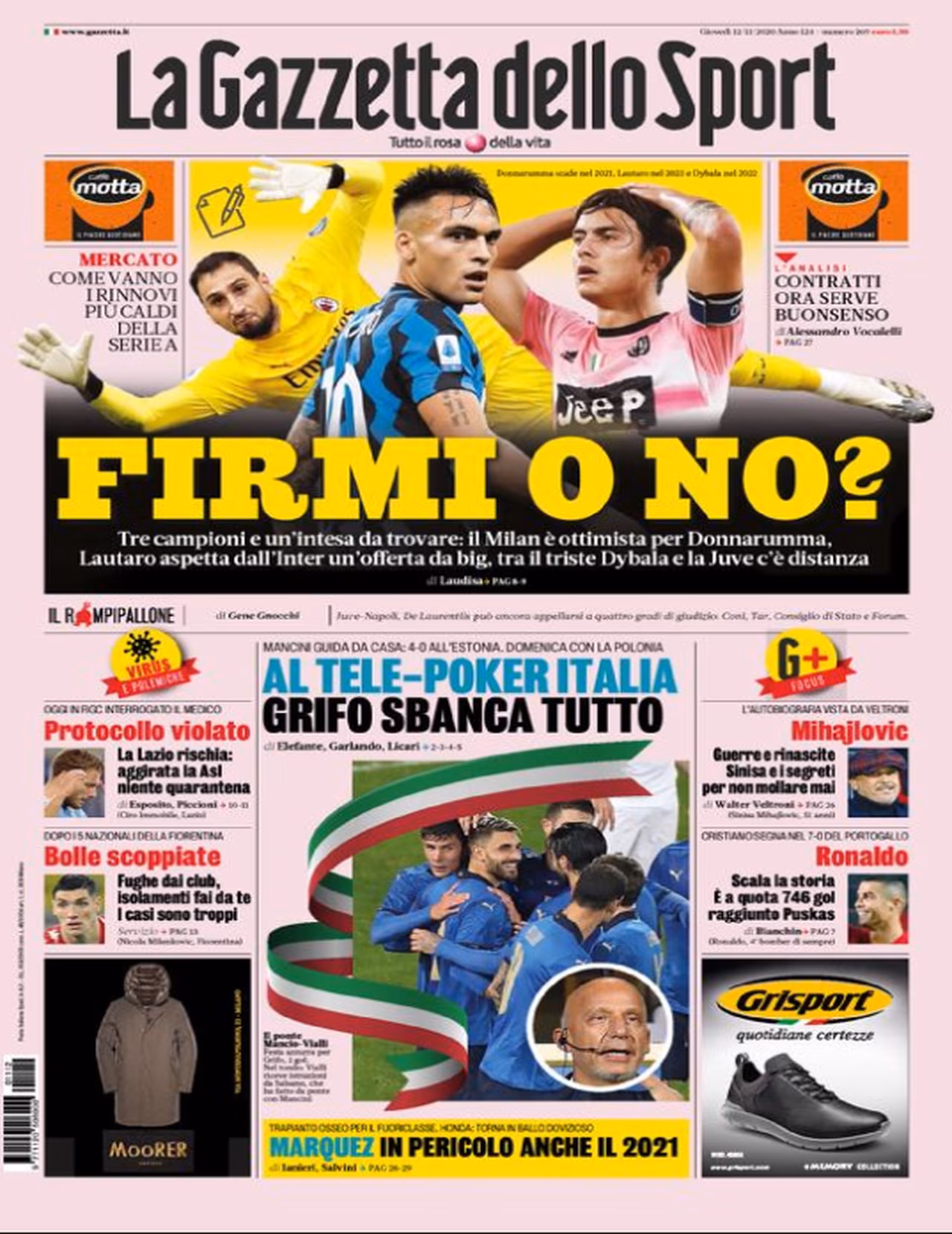 TORINO- La Gazzetta dello Sport in edicola oggi si concentra sui possibili rinnovi di tre big: Gianlugi Donnarumma, Lautaro Martinez e Paulo Dybala. Il Milan è ottimista nel primo caso, l’Inter non vuole lasciarsi scappare il proprio numero 10, mentre tra la Juve e la Joya c’è distanza. Spazio poi al netto successo dell’Italia, che in amichevole ha superato con un rotondo 4-0 l’Estonia: