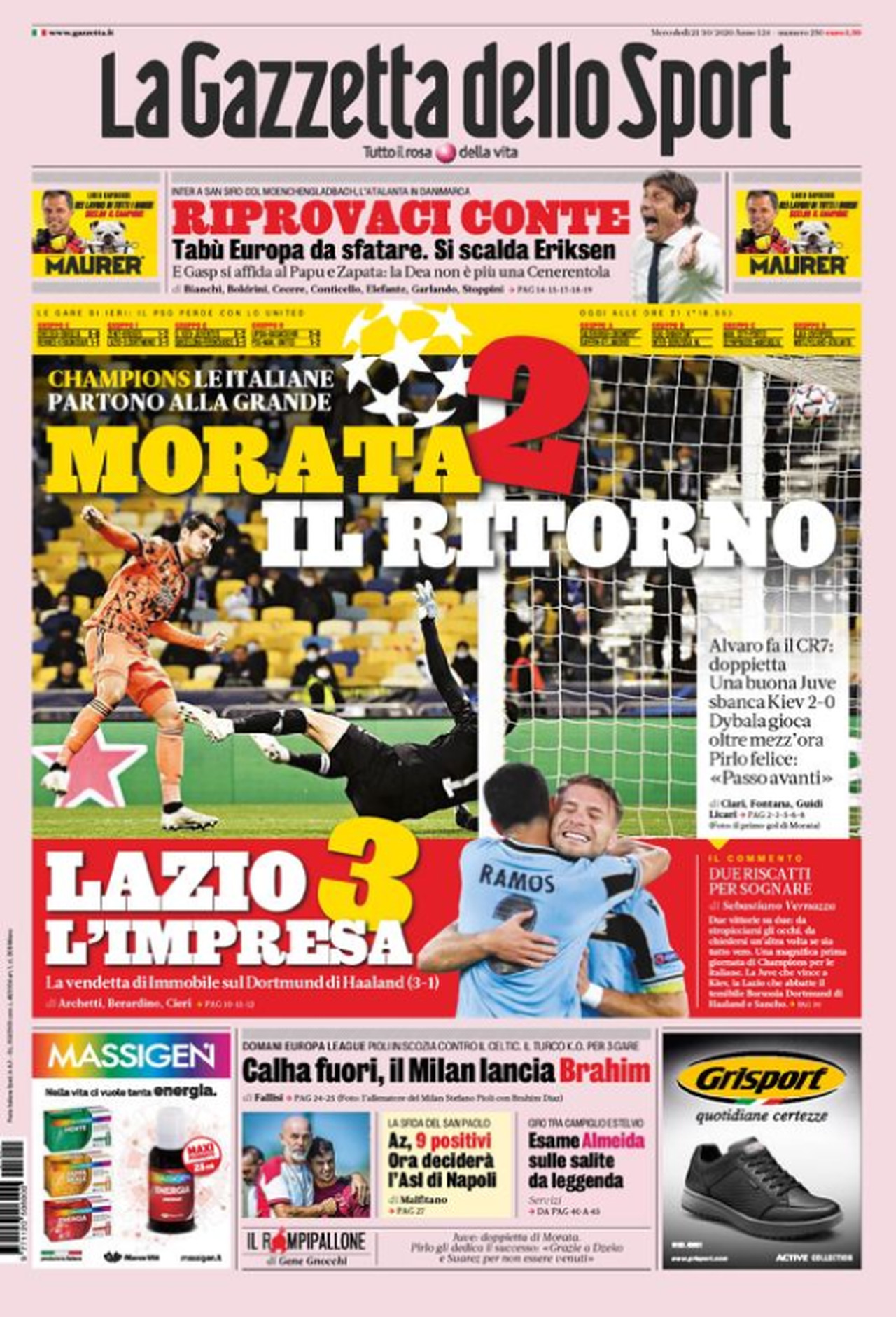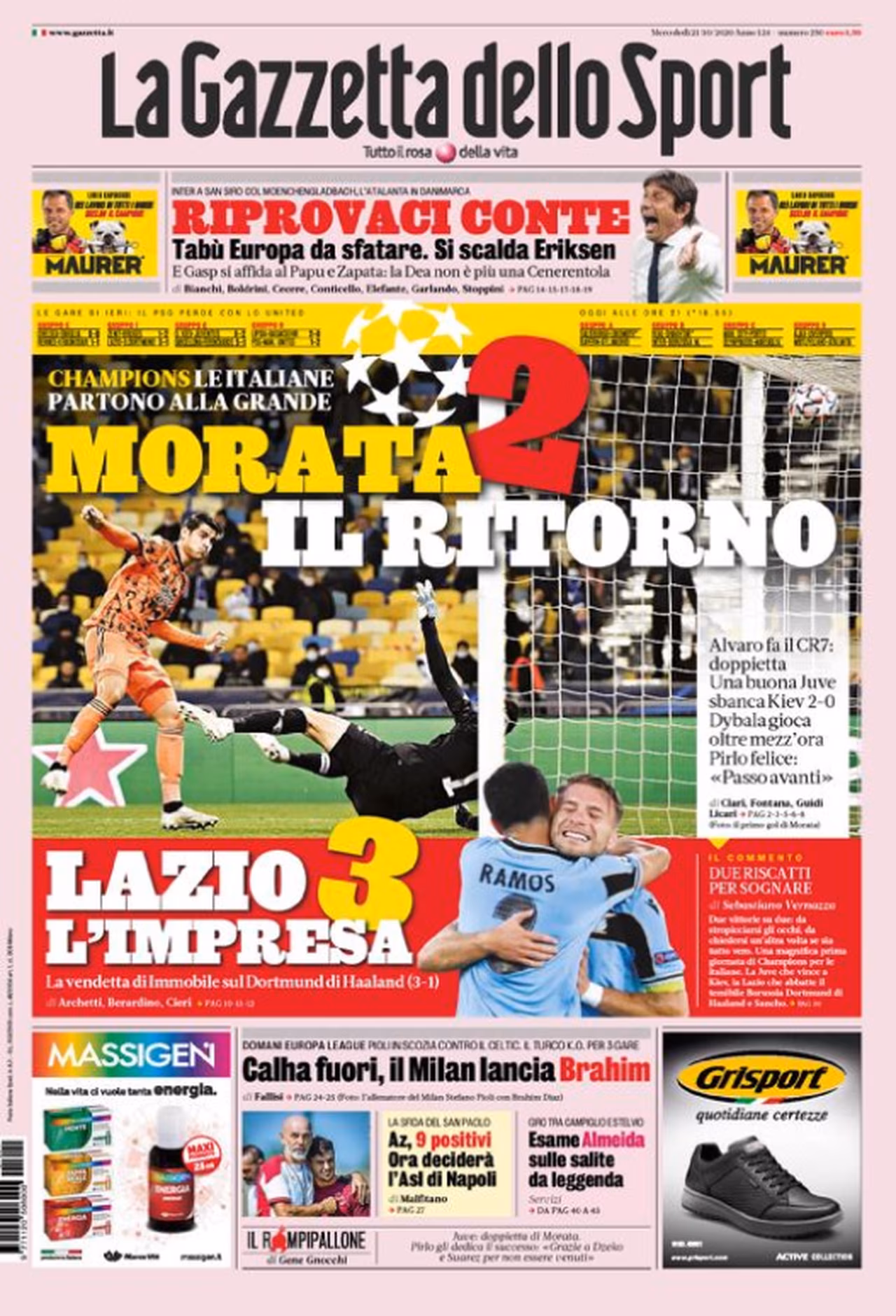 TORINO- La prima pagina della Gazzetta dello Sport si apre lodando Alvaro Morata. Con i suoi primi gol in Europa dal ritorno alla Juve, il centravanti spagnolo ha messo al tappeto la Dinamo Kiev regalando i tre punti alla banda Pirlo. Spazio anche per l’impresa della Lazio che, trascinata da un grande Ciro Immobile, schianta per 3-1 il Borussia Dortmund all’Olimpico. Stasera in campo Inter e Atalanta: