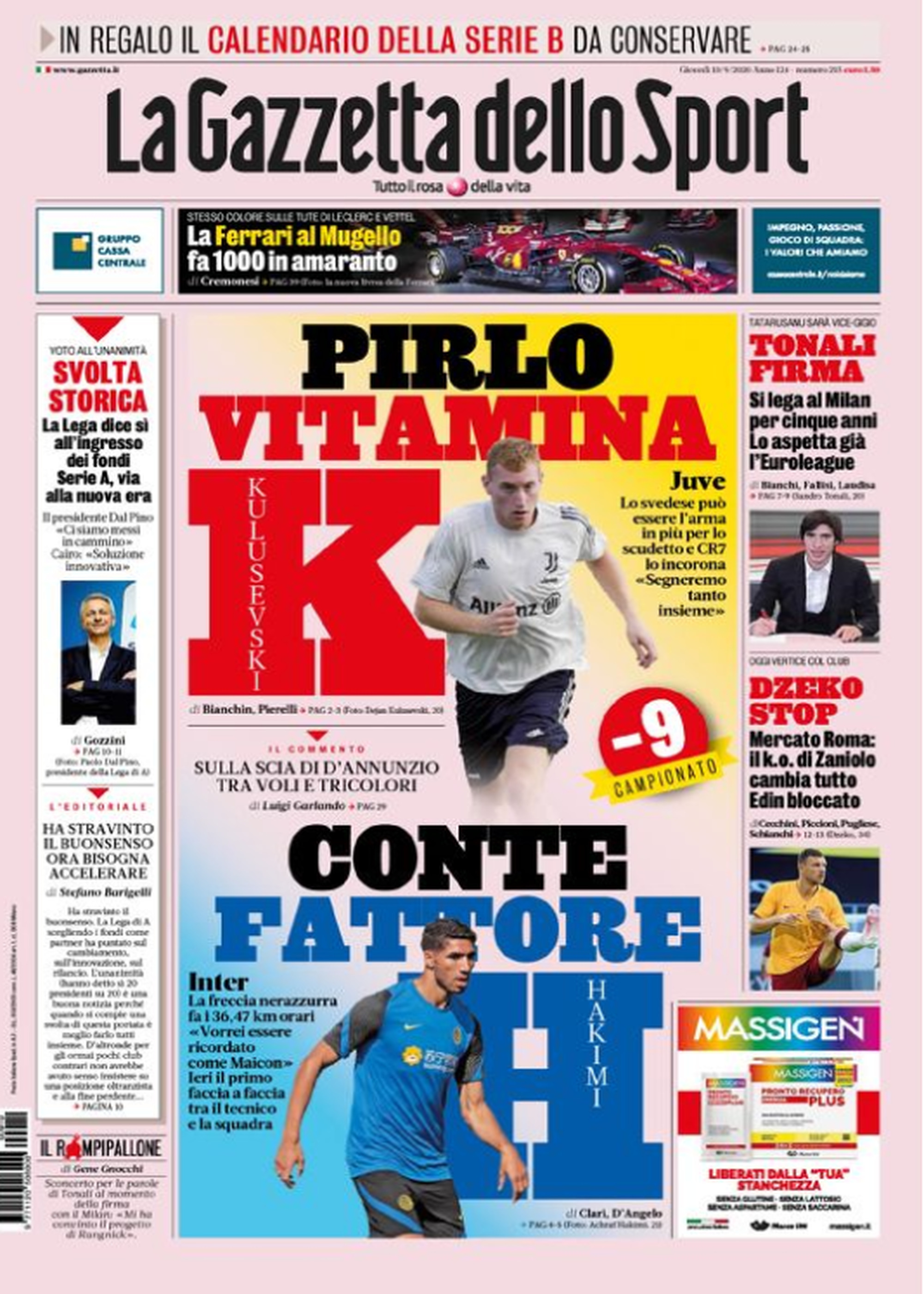 TORINO- La Gazzetta dello Sport in edicola oggi apre concentrandosi su Dejan Kulusevski. Il neo acquisto juventino può essere un’arma importante per i bianconeri verso il decimo scudetto consecutivo. Titolo che verrà conteso dall’Inter, che punterà su nuovi acquisti come Hakimi per riportare il trofeo a Milano. Intanto Tonali ha ufficialmente iniziato la sua avventura al Milan: