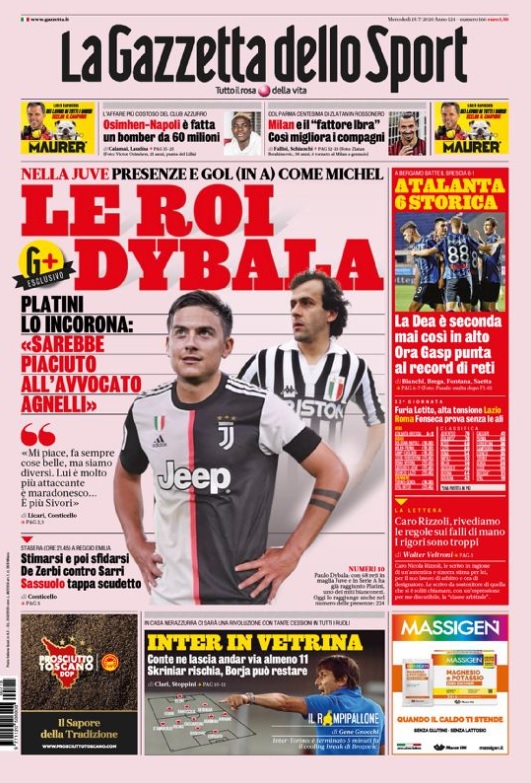 TORINO- La Gazzetta dello Sport in edicola oggi apre con il titolo “Le Roi Dybala”. Scendendo in campo contro il Sassuolo stasera, infatti, l’argentino raggiungerebbe l’ex numero 10 francese per numero di presenze in bianconero. Intervistato, Platini si è lasciato andare ad un “sarebbe piaciuto all’Avvocato Agnelli”. Intanto l’Atalanta prosegue la sua marcia inarrestabile travolgendo per 6-2 il Brescia, mentre il Napoli mette a segno il colpo Osimhen. In casa Inter, invece, si prepara una nuova rivoluzione. Ma attenzione perché, proprio poco fa, sono arrivate anche alcune grosse novità per il mercato bianconero, Paratici si prepara ad un nuovo grande colpo in attacco. Contatti già avviati: si parla di un maxi scambio! >>>VAI ALLA NOTIZIA