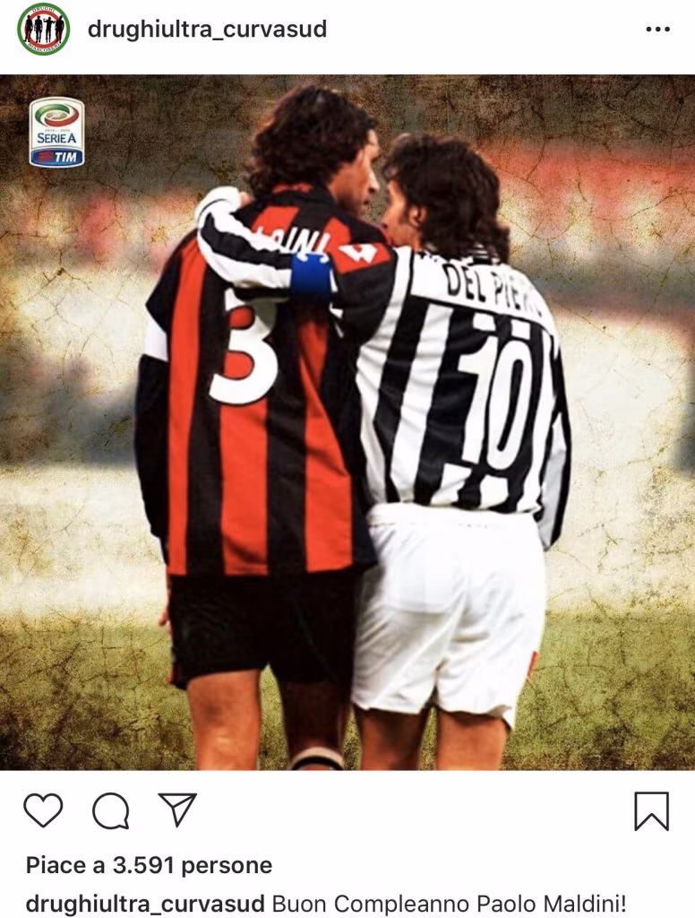 Uno dei gruppi più importanti del tifo bianconero ha voluto celebrare il compleanno del rivale di tantissime battaglie, quel Paolo Maldini che nel corso della sua carriera ha vestito solamente la casacca rossonera del Milan. I Drughi hanno postato sul proprio profilo ufficiale di Instagram una foto nella quale l’ex leggenda bianconera Alessandro Del Piero abbraccia l’ex capitano rossonero.