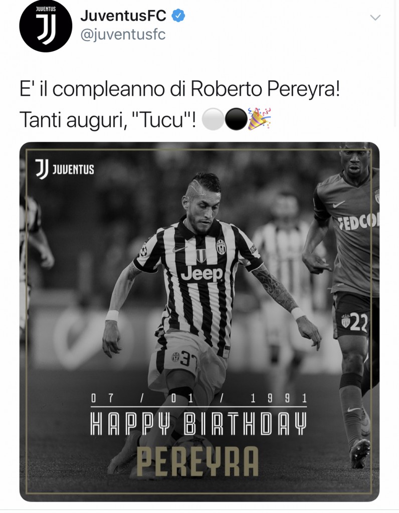 Roberto Pereyra, soprannominato “El Tucuman”, oggi ha compiuto 28 anni e la Juventus ha deciso di fargli auguri tramite il profilo ufficiale su