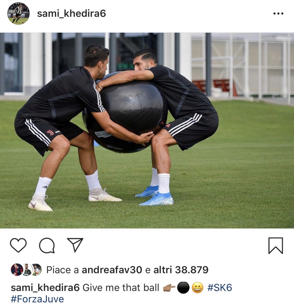 Quest’oggi una delle coppie più attive dell’esercizio era quella tedesca, composta dai Emre Can e Khedira. I due centrocampisti sono stati immortalati dal fotografo della squadra mentre i due lottavano con molta animosità. L’ex Real Madrid ha poi deciso di postare lo scatto sul proprio profilo Instagram commentandola in questo modo: “Dammi quella palla!”.