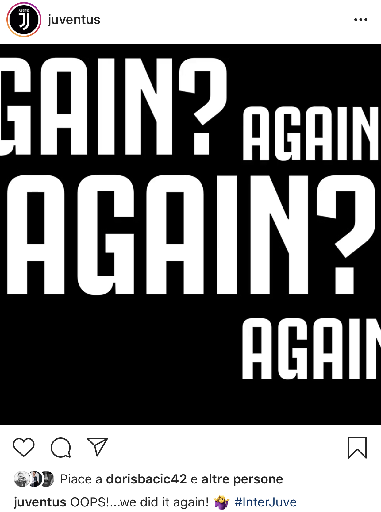 La società bianconera non ha mancato di celebrare questo fondamentale successo sui canali social ufficiali. Su Instagram ha difatti postato con un pizzico di ironia un video che come audio presenta alcuni stralci di radiocronache dei derby d’Italia a partire dagli anni di Cabrini fino al gol di questa sera messo a segno da Higuain. Il tutto commentato con un eloquente e beffardo: “OOPS…we did it again”.