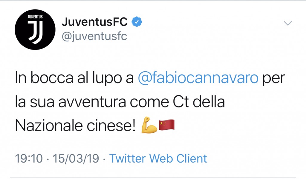 La Juventus ha voluto celebrare questa nomina con un tweet sul proprio profilo ufficiale dove ha commentato in questo modo il nuovo ct subentrato al dimissionario Marcello Lippi: “In bocca al lupo a Fabio Cannavaro per la sua nuova avventura come ct della nazionale cinese”.