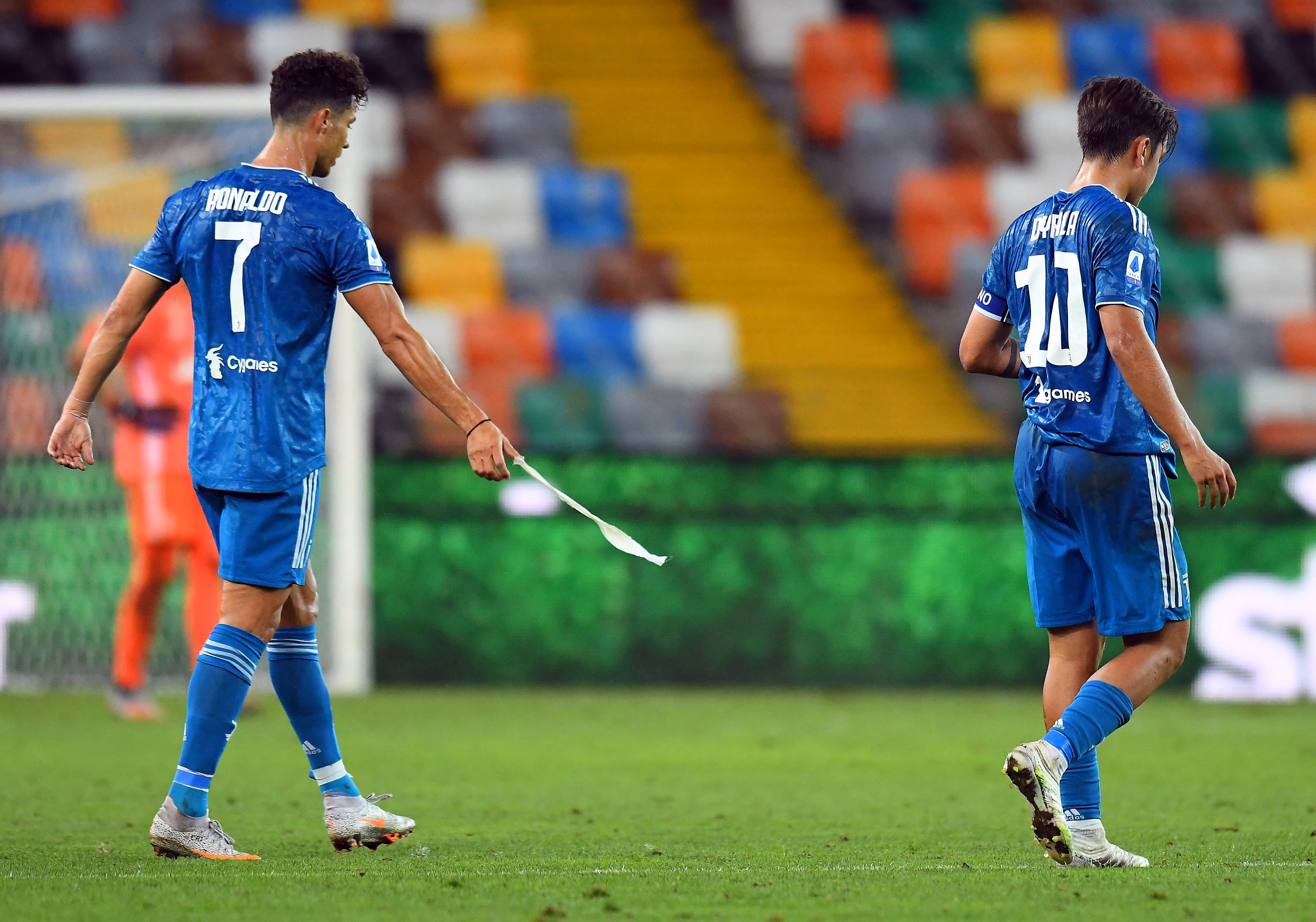 UDINE, ITALY - JULY 23: Cristiano Ronaldo and Paulo Dybala of Juventus reacts after the Serie A match between Udinese Calcio and Juventus at Stadio Friuli on July 23, 2020 in Udine, Italy. (Photo by Alessandro Sabattini/Getty Images)