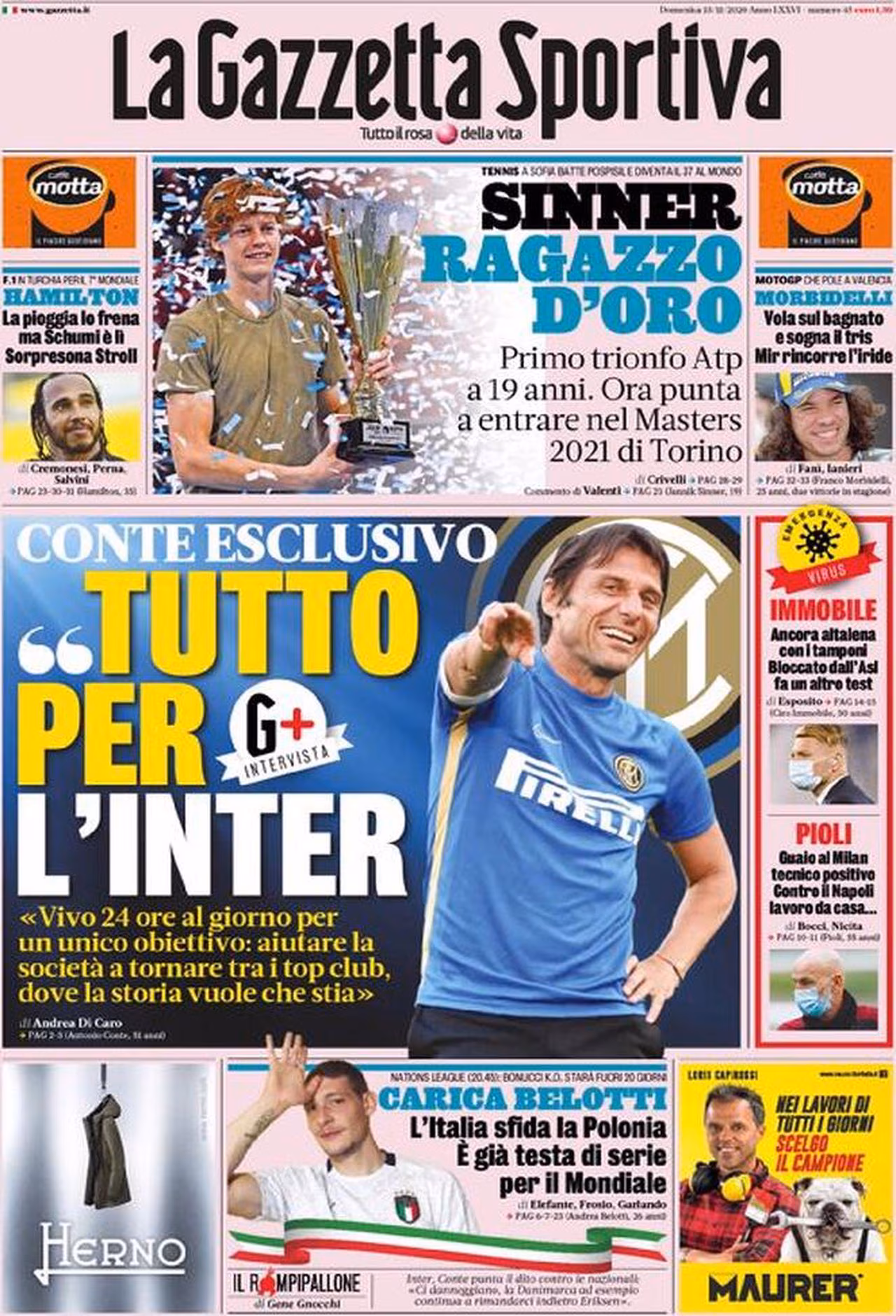 TORINO – Ecco la prima pagina de La Gazzetta dello Sport. Al centro viene dedicato il titolo principale all’ex allenatore della Juventus e della Nazionale Italiana Antonio Conte. Il tecnico, infatti, ha parlato in esclusiva al giornale milanese in un’intervista: “Conte esclusivo: ‘ Tutto per l’Inter. Vivo 24 ore al giorno per un unico obiettivo: aiutare la società a tornare tra i top club, dove la storia vuole che stia‘“. Il titolo in fondo, invece, viene dedicato agli impegni degli Azzurri, che questa sera affronteranno la Polonia: “Nations League (20:45): Bonucci K.O., starà fuori 20 giorni. Carica Belotti: l’Italia sfida la Polonia. È già testa di serie per il Mondiale“.