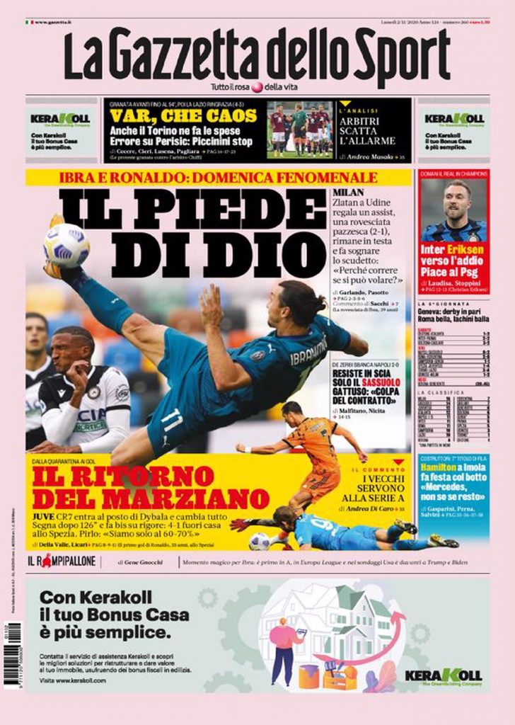 TORINO – La prima pagina de La Gazzetta dello Sport intitola così: “Il piede di Dio”. Il riferimento è alla rovesciata di Ibrahimovic che ha deciso la vittoria contro l’Udinese.