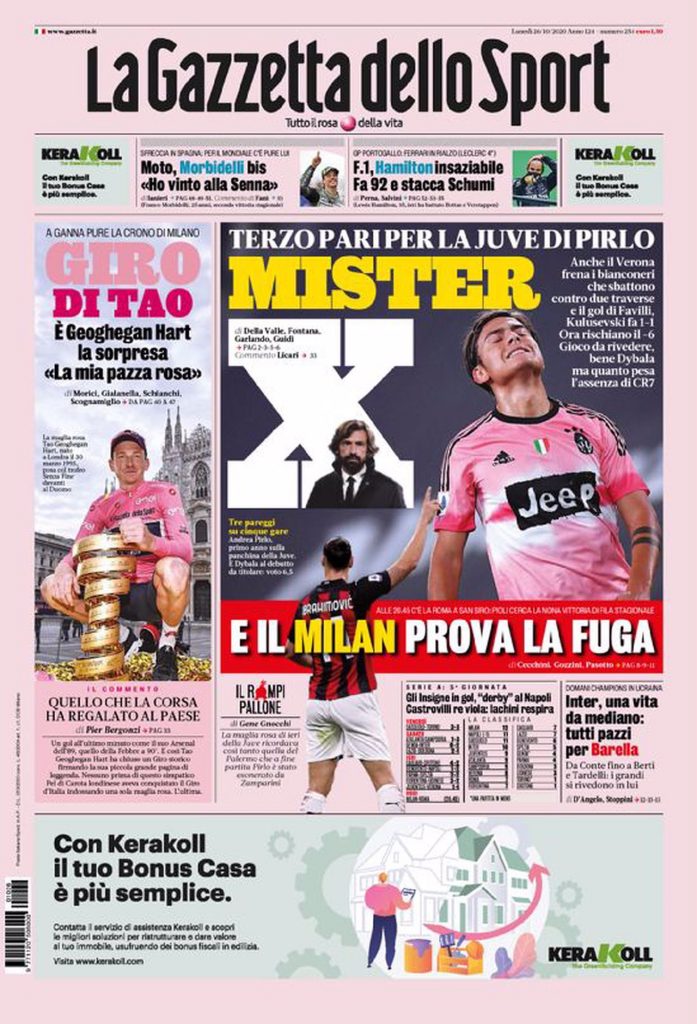 TORINO – La prima pagina de La Gazzetta dello Sport intitola così: “Mister X”. Il riferimento è al terzo pareggio per la Juventus di Pirlo, che ieri è stata fermata in casa dall’Hellas Verona 1-1.