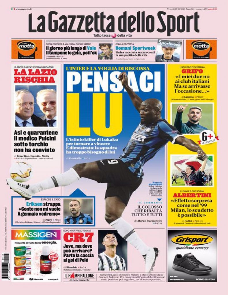 TORINO – La prima pagina de La Gazzetta dello Sport intitola così: “Pensaci Lu”. Il riferimento è a Romelu Lukaku, attaccante dell’Inter, che è tornato ad allenarsi e ad essere a disposizione di Conte.