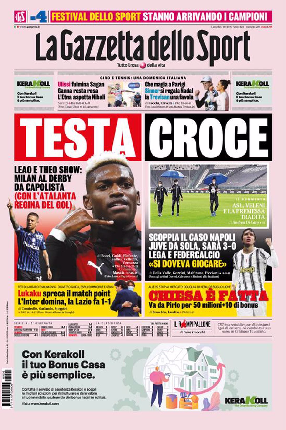 TORINO – La prima pagina de La Gazzetta dello Sport intitola così: “Testa croce”. Testa si riferisce alle vittorie di Milan e Atalanta che sono prime in classifica a punteggio pieno, mentre croce si riferisce al match Juventus-Napoli in cui ha regnato il caos. Ma attenzione perché poco fa è arrivata un’altra bomba dell’ultim’ora da Sky Sport. Paratici letteralmente scatenato, Gianluca Di Marzio ha dato l’annuncio: “Colpo last minute, dopo Chiesa arriva anche…” >>>VAI ALLA NOTIZIA