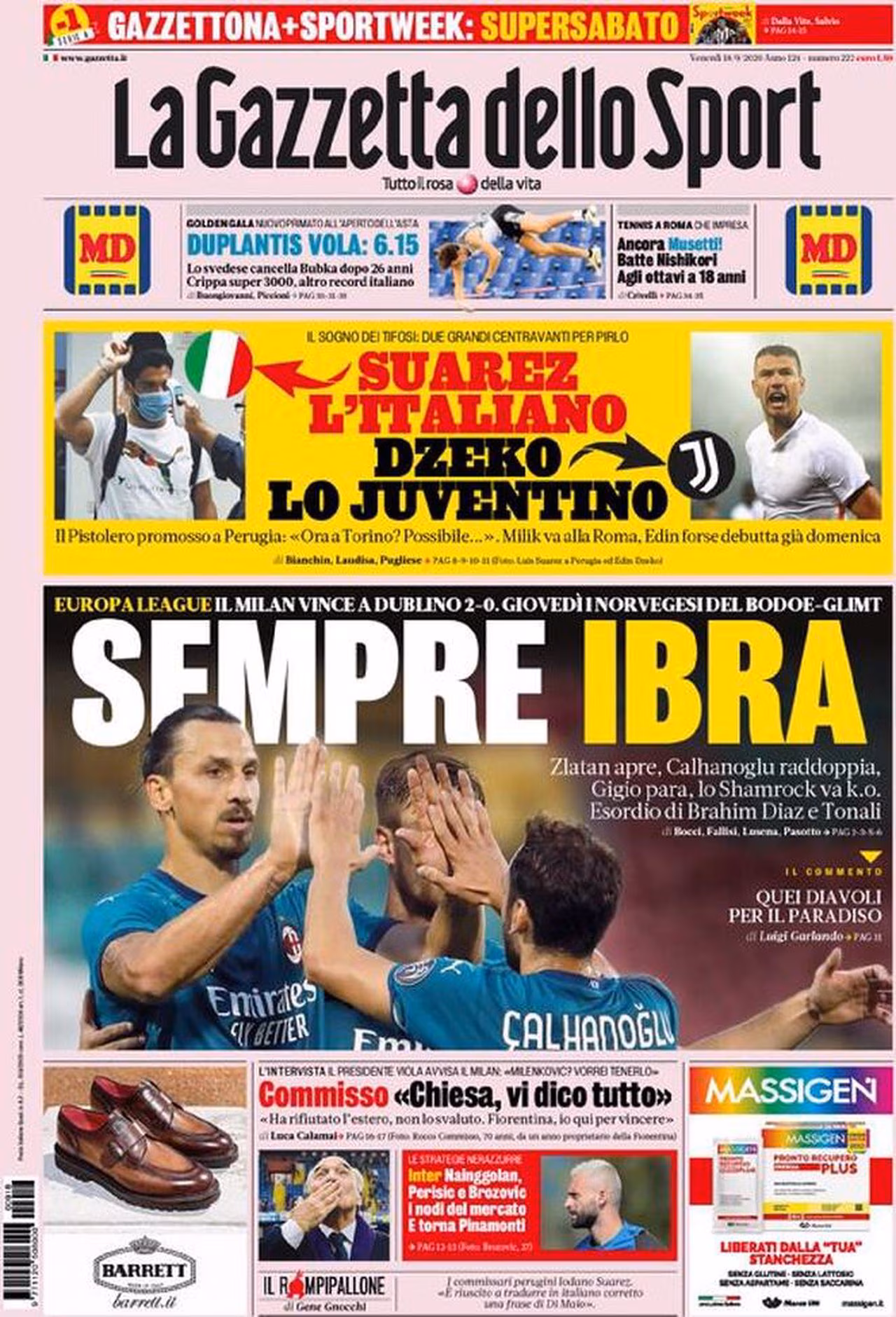 TORINO – Ecco la prima pagina de La Gazzetta dello Sport. Nel taglio alto le parole del quotidiano sul mercato della Juventus: “Il sogno dei tifosi: due grandi centravanti per Pirlo. Suarez l’italiano e Dzeko lo juventino. Il Pistolero promosso a Perugia: “Ora Torino? Possibile…”. Milik va alla Roma, Edin forse debutta già domenica“. I bianconeri, quindi, si preparano ad accogliere il bomber bosniaco e, forse, stanno preparando un posto anche per l’uruguayano.