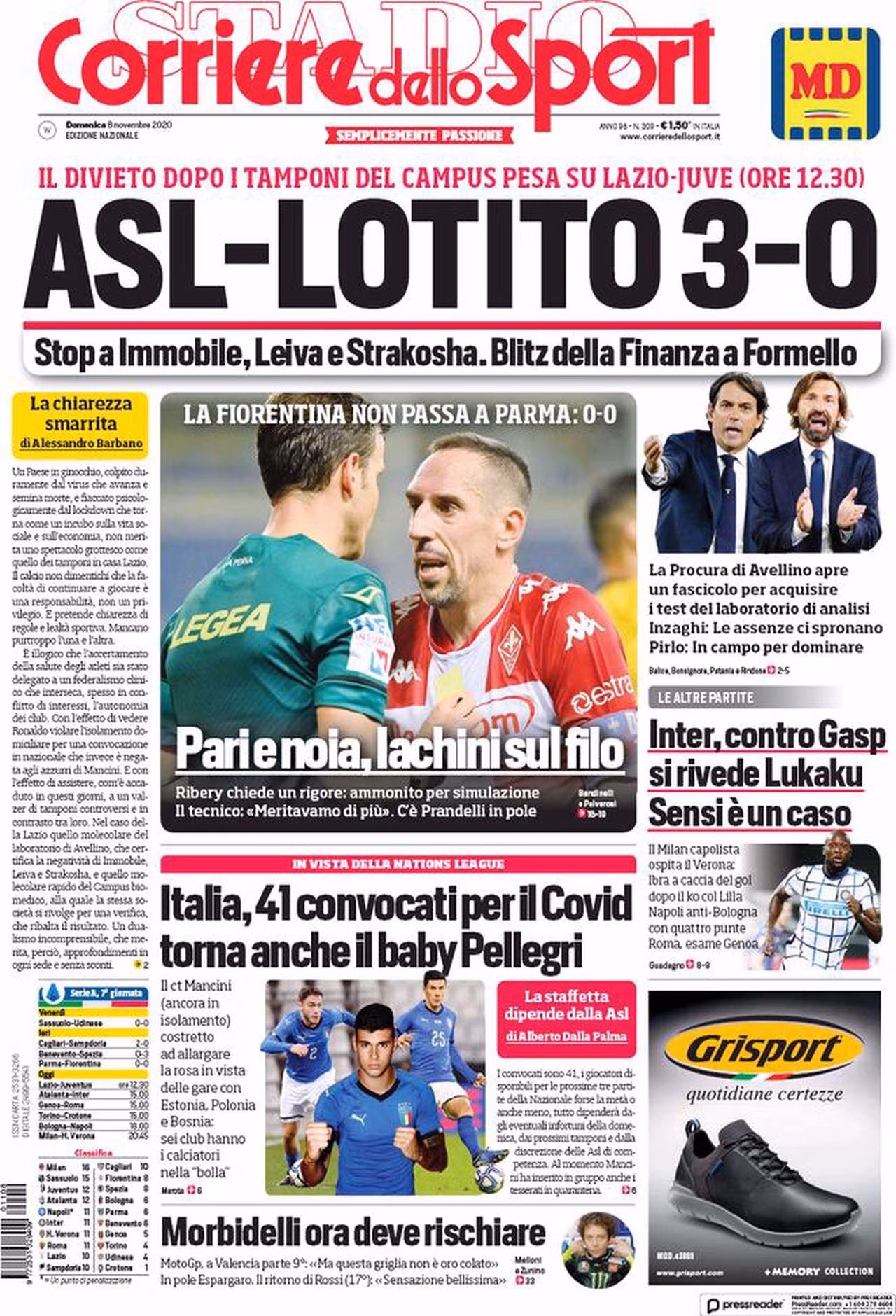 TORINO – Ecco la prima pagina del Corriere dello Sport. Il quotidiano ha dedicato il titolo centrale alla vicenda del caos tamponi per la Lazio, squadra che oggi affronterà la Juventus. “Asl-Lotito 3-0. Il divieto dopo i tamponi del Campus pesa su Lazio-Juve (ore 12:30). Stop a Immobile, Leiva e Strakosha. Blitz della Finanza a Formello“. I biancocelesti, dunque, dovranno fare a meno di questi tre giocatori nel big match dell’Olimpico contro la Vecchia Signora.