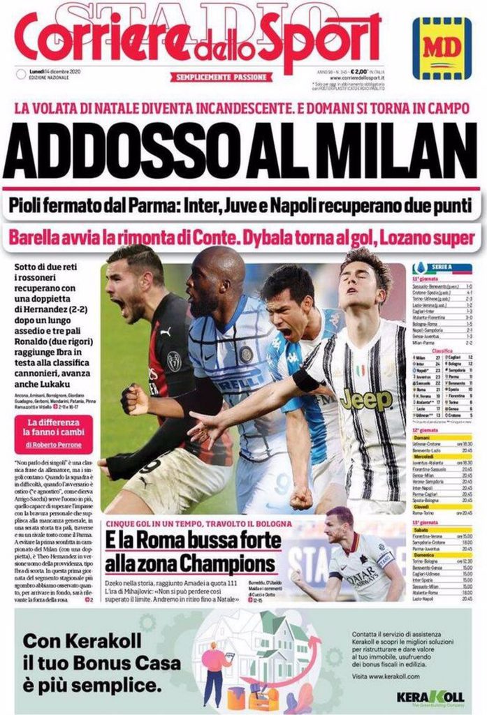 TORINO – La prima pagina del Corriere dello Sport intitola così: “Addosso al Milan”. Il riferimento è alle vittorie di Juventus e Inter che si sono portate e -4 e -3 dal Milan che ieri sera ha pareggiato 2-2 con il Parma.