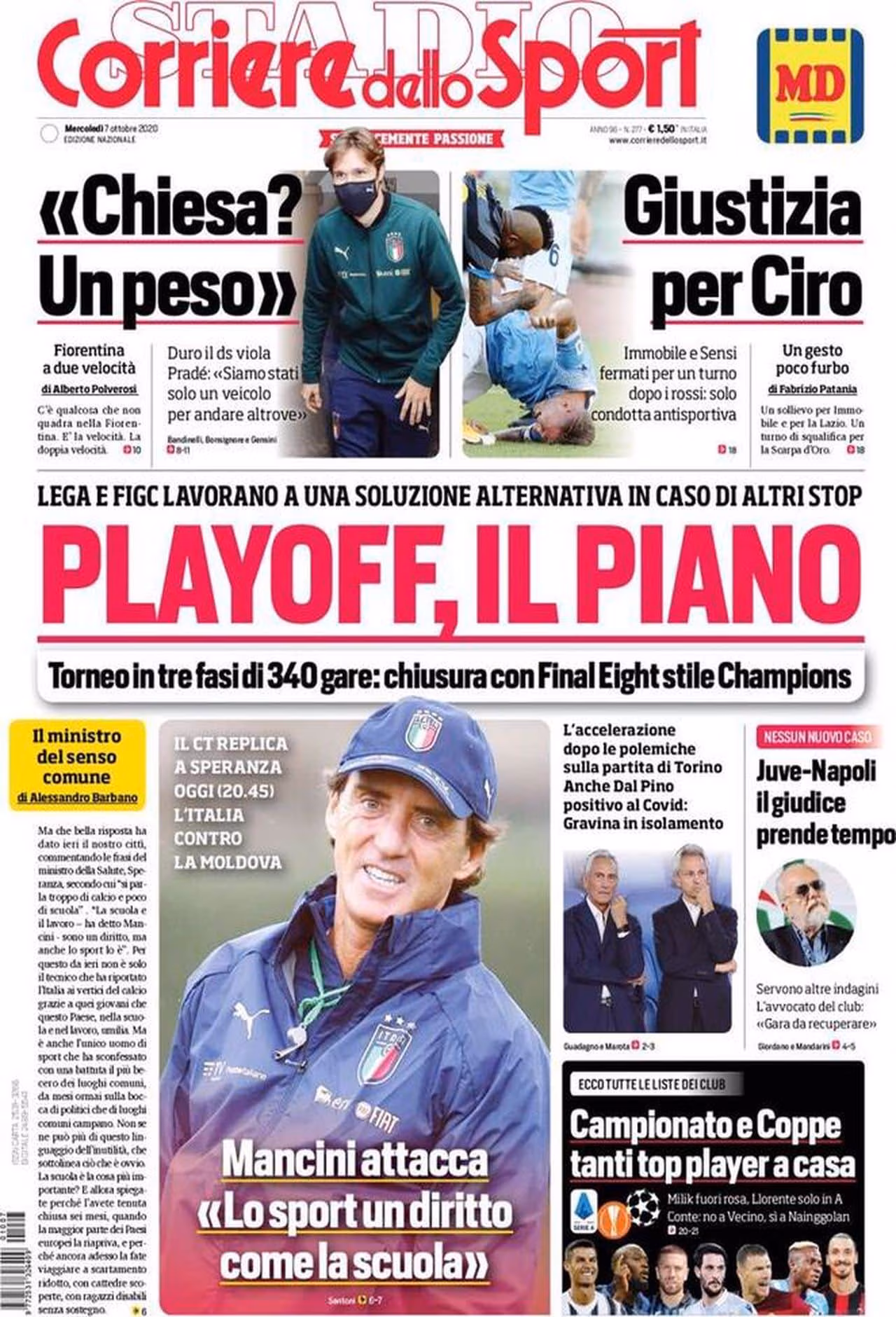 TORINO – Ecco la prima pagina del Corriere dello Sport. Nel taglio a destra è dedicato un trafiletto alla vicenda che riguarda il mancato match tra Juventus e Napoli, su cui ancora non sono stati presi provvedimenti. Il quotidiano scrive: “Juve-Napoli, il giudice prende tempo. Servono altre indagini. L’avvocato del club (Napoli, ndr): “Gara da recuperare”“. Il titolo centrale, invece, riguarda tutto il campionato di Serie A: la Lega, infatti, starebbe lavorando ad un nuovo progetto in caso di nuovi problemi causati dal coronavirus. Ecco quanto scritto dal Corriere dello Sport: “Lega e FIGC lavorano ad una soluzione alternativa in caso di altri stop. Playoff, il piano. Torneo in tre fasi di 340 gare: chiusura con Final Eight stile Champions“.