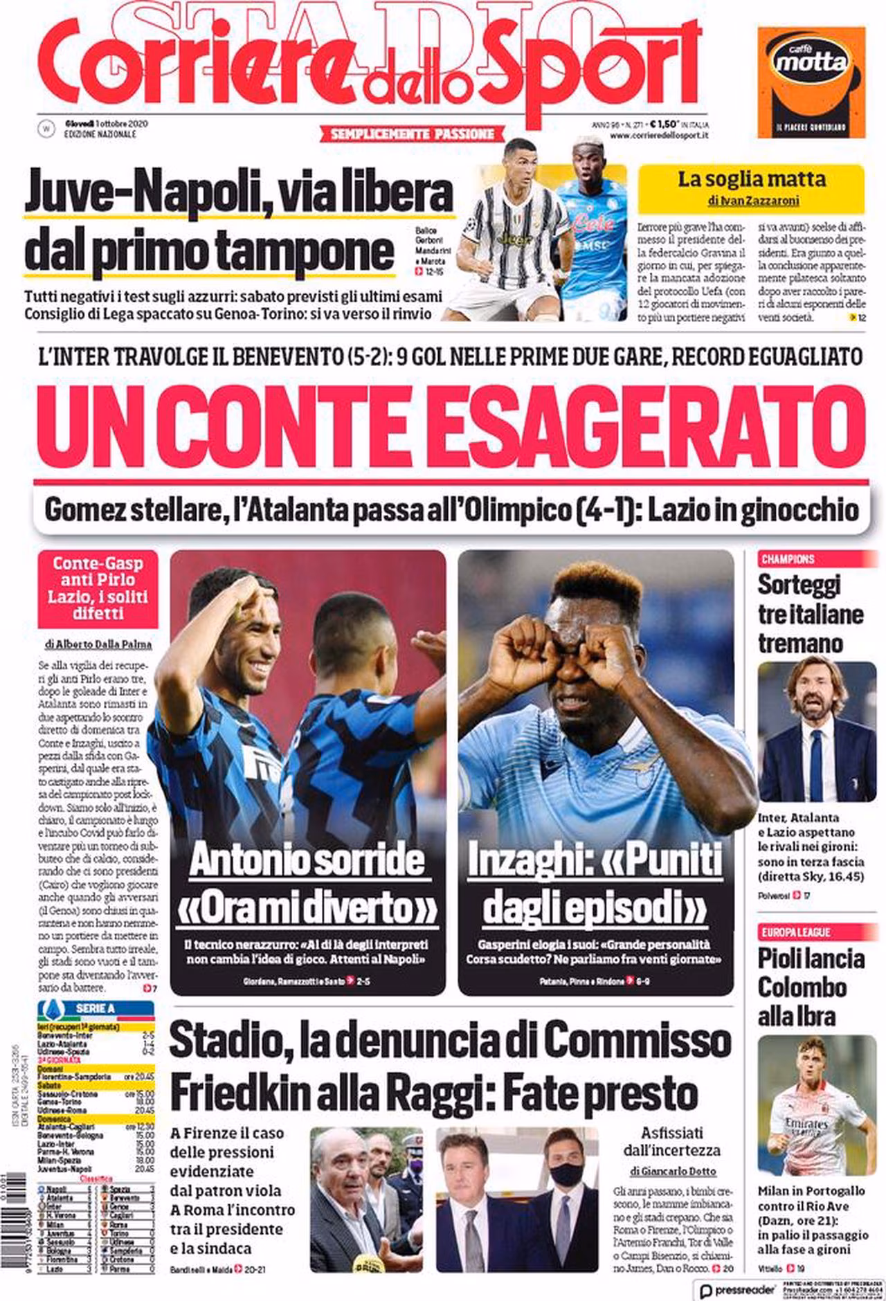TORINO – Ecco la prima pagina del Corriere dello Sport. Il titolo in taglio alto è dedicato alla conferma della negatività al coronavirus dei giocatori del Napoli, dopo aver affrontato il Genoa nell’ultima giornata di campionato. “Juve-Napoli, via libera dal primo tampone. Tutti negativi i test sugli azzurri: sabato previsti gli ultimi esami. Consiglio di Lega spaccato su Genoa-Torino: si va verso il rinvio“. Per il momento, dunque, il match della seconda giornata di campionato tra Juventus e Napoli si giocherà: si attende il secondo tampone che effettueranno i partenopei per la conferma definitiva. Nel taglio a destra, poi, viene dedicato un piccolo spazio ai sorteggi per i gironi della Champions League 2020-2021, che ci saranno oggi pomeriggio alle 16:45. “Sorteggi, tre italiane tremano. Inter, Atalanta e Lazio aspettano le rivali nei gironi: sono in terza fascia“. Anche i bianconeri saranno coinvolti nel sorteggio, ma saranno una delle teste di serie.