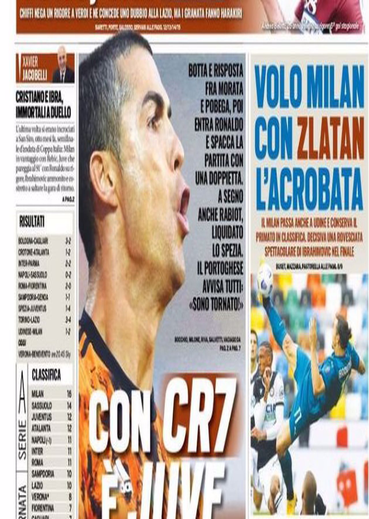 TORINO – La prima pagina di Tuttosport intitola così: “Con CR7 è Juve show”. Il riferimento è alla doppietta di Cristiano Ronaldo contro lo Spezia che ha deciso la partita.