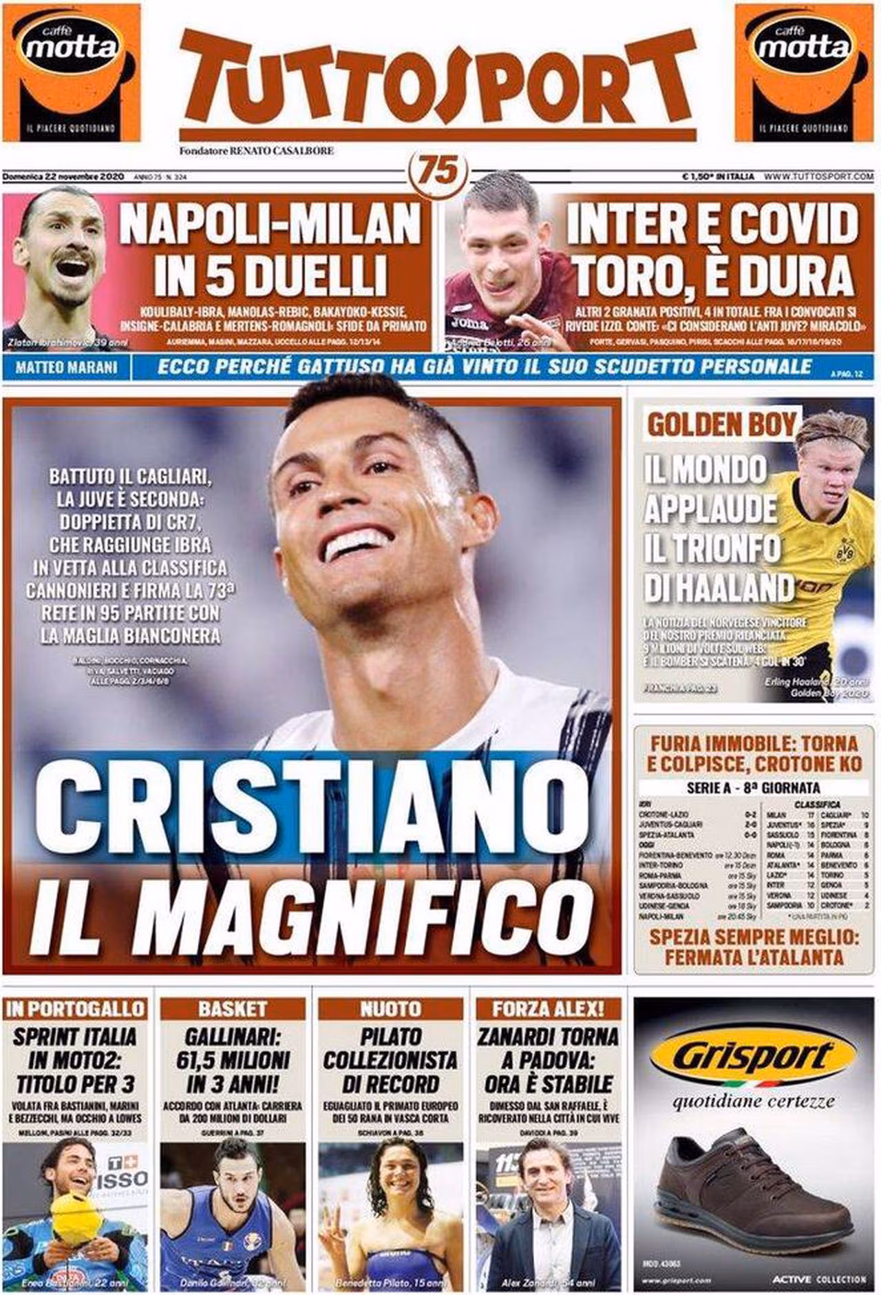 Prima pagina TuttoSport 22-11-2020
