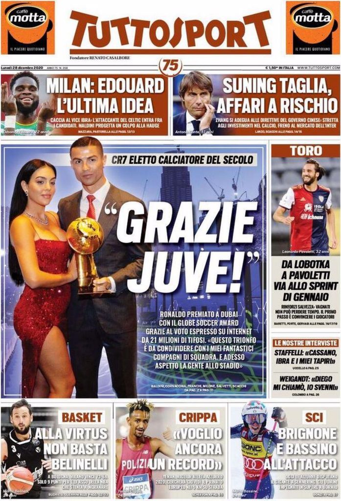 TORINO – La prima pagina di Tuttosport del 28 dicembre intitola così: “Grazie Juve”. In prima pagina, infatti, c’è una grande foto di Cristiano Ronaldo con Georgina con in mano il Globe Soccer Awards per il migliore giocatore del 21esimo secolo. Queste parole si riferiscono al post di ringraziamenti che il portoghese ha fatto sui social dopo aver ritirato il premio che ha questa didascalia: “Non potrei essere più felice per il premio di questa sera! Sono quasi al mio ventesimo anno di carriera calcistica, il Globe Soccer Player of the Century è un riconoscimento che prendo con tanta gioia e orgoglio. Una volta ancora, gran serata di gala a Dubai in un posto meraviglioso come il Burj Khalifa. Congratulazioni a Robert Lewandowski per il premio di Giocatore dell’Anno, ad Hans Flick come Miglior Allenatore dell’Anno e Pep Guardiola come Miglior tecnico del Secolo. Poi Casillas e Piqué per i loro premi alla Carriera. Per ultimo, ma non ultimo, congratulazioni al mio amico Jorge Mendes per il premio di Agente del Secolo. Infine, devo ringraziare ancora la Royal Family di Dubai per il rispetto, l’amicizia, l’ospitalità che ricevo sempre nella meravigliosa Dubai. A tutti i fan che hanno votato per me in tutto il mondo, oltre 21 milioni“.