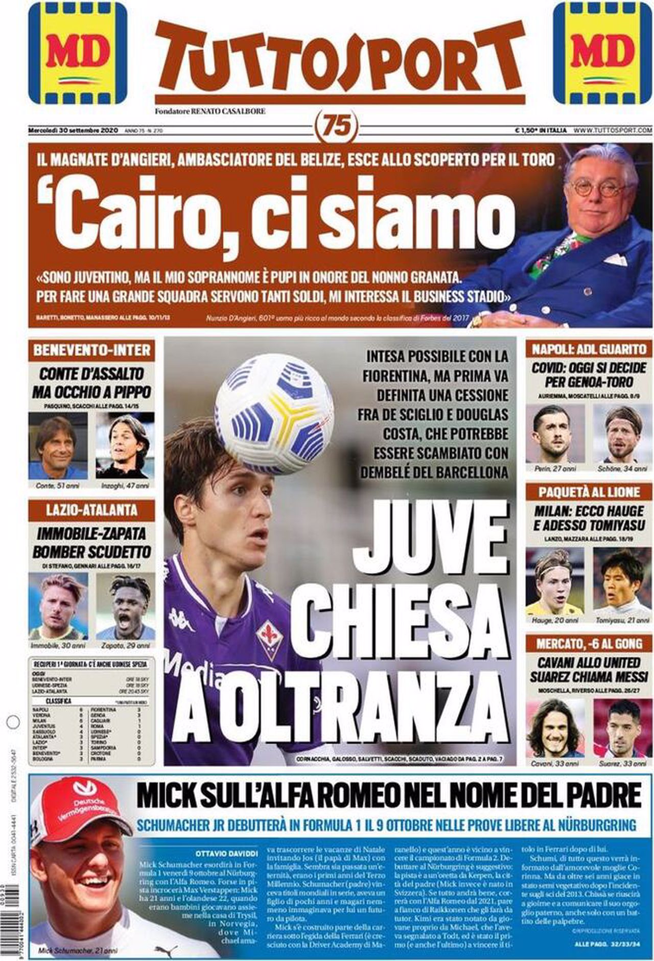 Prima pagina TuttoSport 30-09-2020