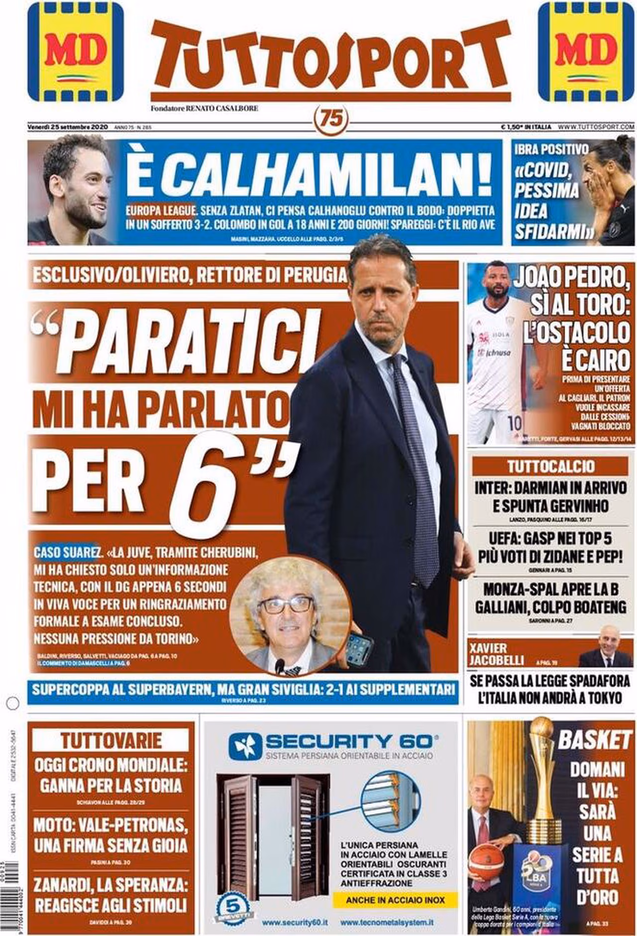 Prima pagina TuttoSport 25-09-2020