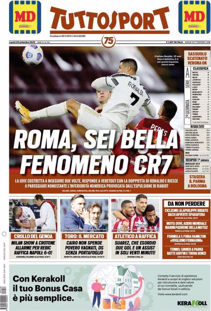 La prima pagina di Tuttosport: “Roma sei bella, fenomeno CR7”