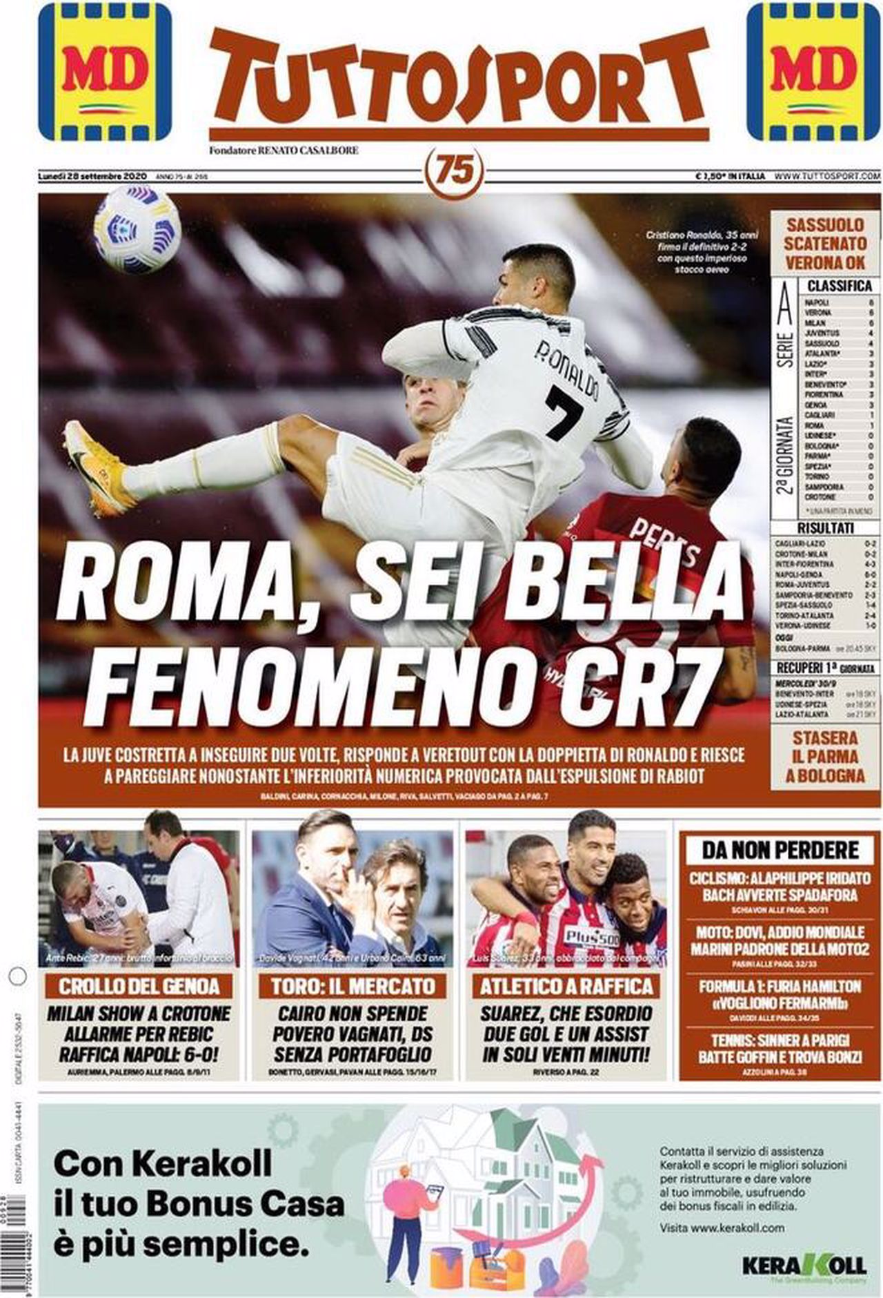 TORINO – La prima pagina di Tuttosport: “Roma sei bella, fenomeno CR7”. Il riferimento è al match di ieri sera dell’Olimpico, in cui la Roma ha messo in difficoltà la Juventus che ha pareggiato grazie ad una doppietta di Cristiano Ronaldo. E attenzione perché, proprio dopo la partita contro la Roma, è scattato l’allarme in casa bianconera. Servono rinforzi subito: scelta fatta, ecco chi può arrivare! >>>VAI ALLA NOTIZIA