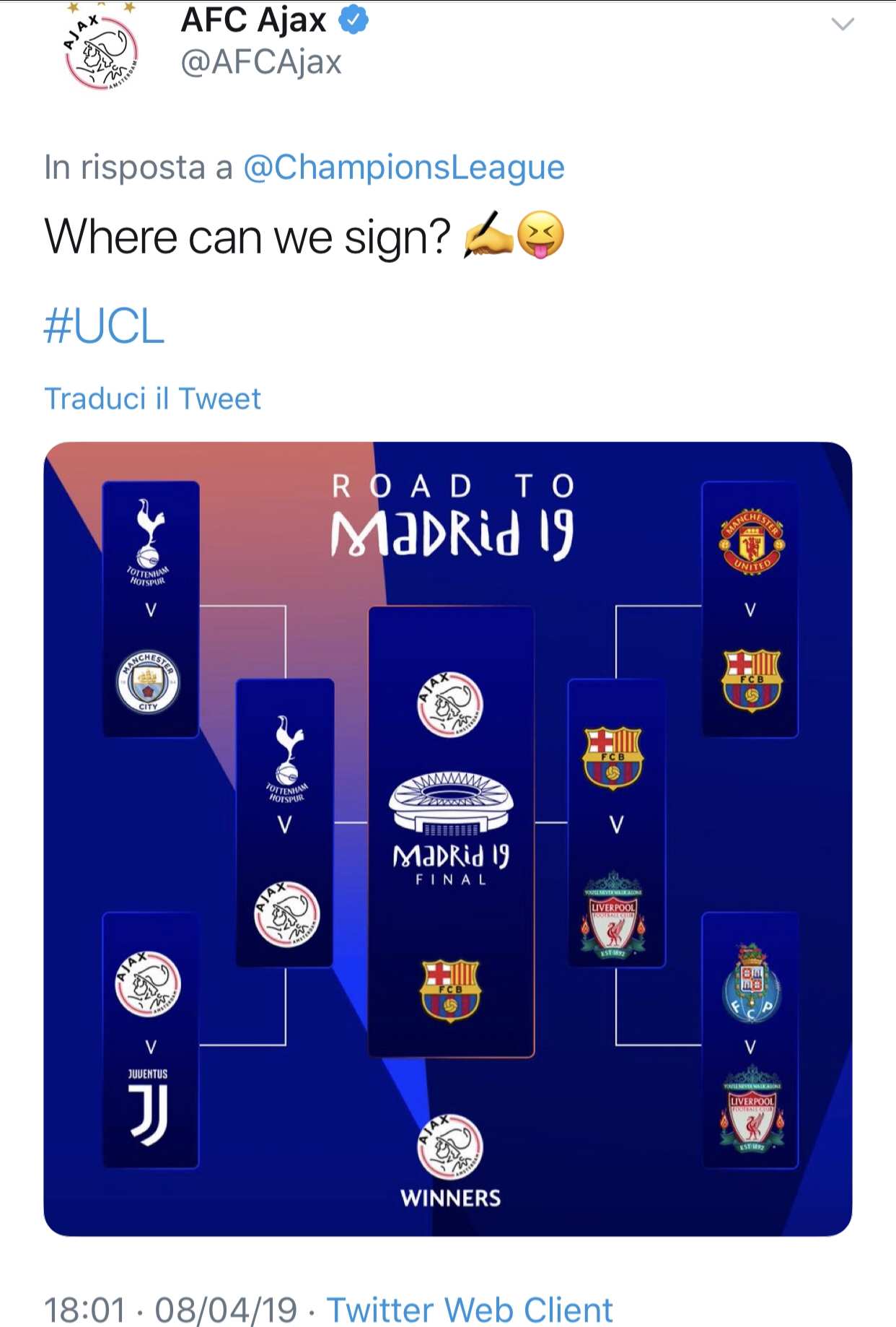 L’08 Aprile la Uefa aveva chiesto a tutti i suoi followers di provare a fare un pronostico relativo alla Champions Legaue ed il club olandese non si è fatto pregare rispondendo già nella stessa giornata al quesito indovinando le due semifinali che si disputeranno a breve: Barcellona-Liverpool e Tottenham-Ajax, commentando la previsione con ironico: “Dove dobbiamo firmare?”.