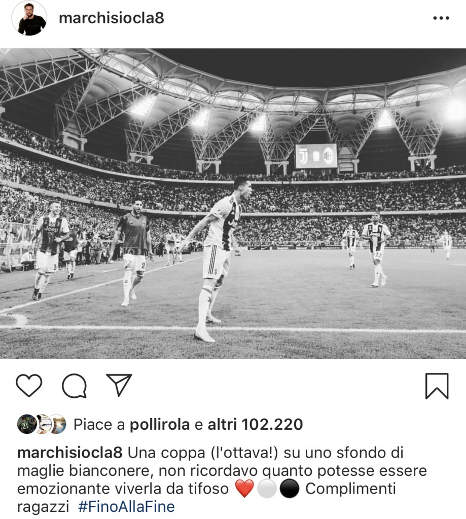 la sfida del King Abdullah Sports City tra il Milan e la Juventus che ha così sollevato il primo trofeo stagionale. L’ex principino bianconero ha commentato la foto scrivendo: “Una coppa (l’ottava!) su uno sfondo di maglie bianconere, non ricordavo quanto potesse essere emozionante viverla da tifoso. Complimenti ragazz. #FinoAllaFine”.