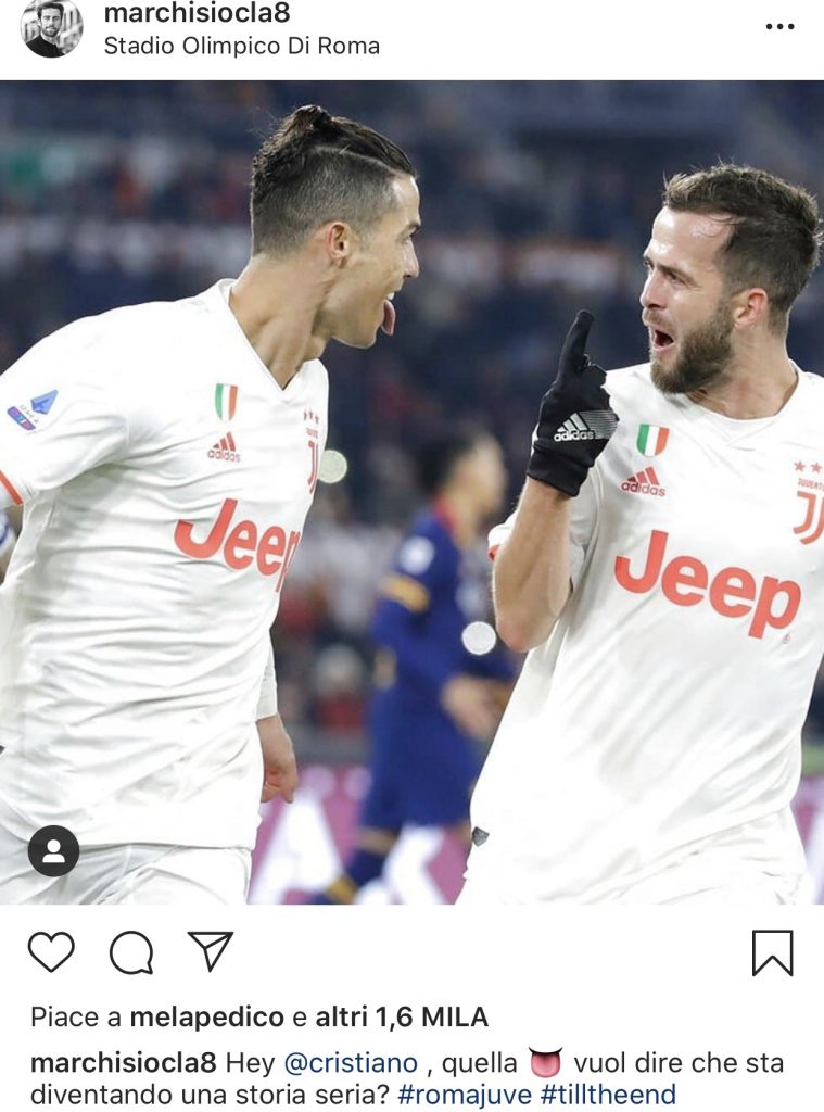 Claudio Marchisio, ex centrocampista bianconero, ha voluto commentare il successo conquistato dalla squadra di Sarri allo Stadio Olimpico contro la Roma postando una foto dell’esultanza di Cristiano Ronaldo che, prima dell’immancabile “siuuuuu” ha fatto una linguaccia a Pjanic. L’ex “principino” ha difatti commentato lo scatto scrivendo: “Hey Cristiano, quella linguaccia vuol dire che sta diventando una cosa seria?”. Molti tifosi hanno subito commentato il post accostando il gesto del portoghese all’esultanza abituale di Alessandro Del Piero. Vedremo se “Pinturicchio” risponderà, commentando questo inedito modo di esultare per CR7.