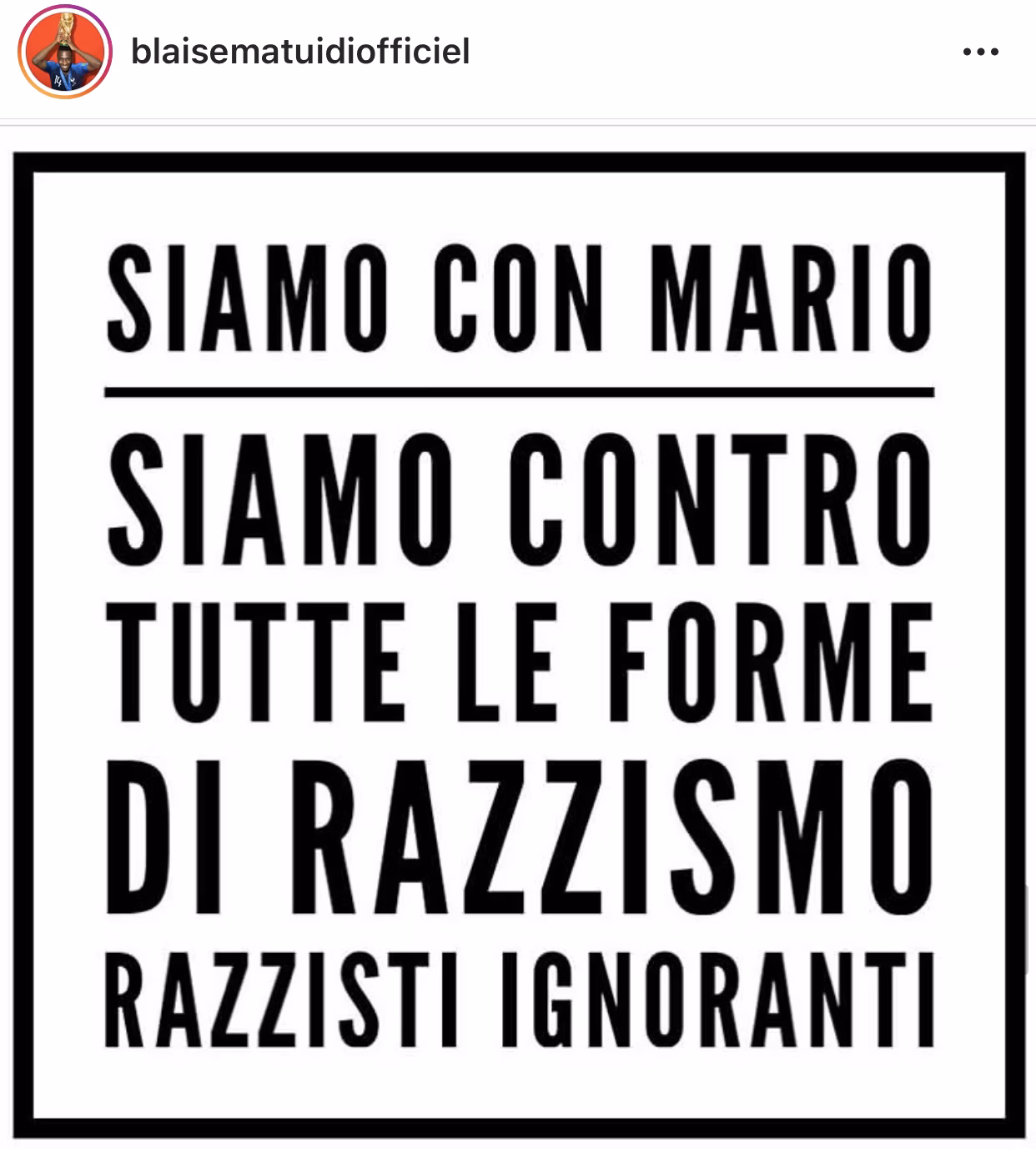 Quest’oggi allo Stadio Bentegodi di Verona, Mario Balotelli ha reagito ai cori razzisti rivolti dal pubblico di casa nei suoi confronti, calciando la palla in curva ed il direttore di gara ha deciso di sospendere il gioco per oltre tre minuti. Tra i tanti messaggi di solidarietà pubblicati sui social network, è arrivato anche quello di un giocatore della Juventus, Blaise Matuidi che ha deciso di pubblicare sul proprio account la frase pubblicata poco dopo la partita di Verona dal procuratore dell’attaccante del Brescia, Mino Raiola: “Siamo con Mario. Siamo contro tutte le forme di razzismo. Razzisti ignoranti”.