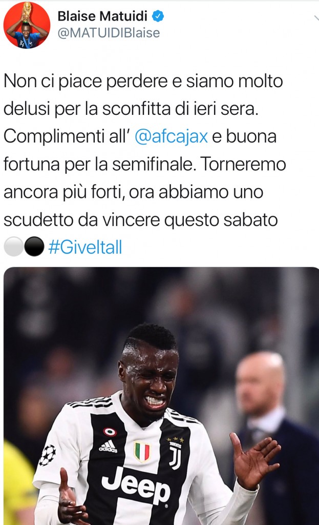 Blaise Matuidi è uno dei ultimi bianconeri a sfogarsi sui social media dopo la cocente eliminazione incassata dai bianconeri ieri sera contro l’Ajax.