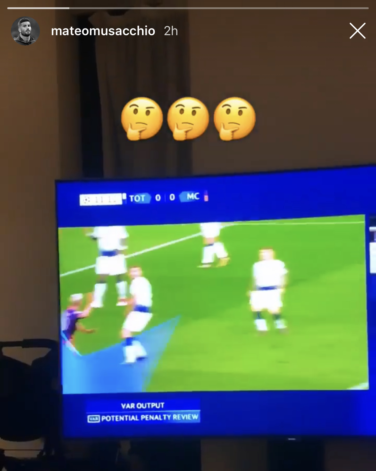 Il difensore del Milan Mateo Musacchio ha postato questa sera una storia nella quale mostra il replay del rigore concesso al Manchester City contro il Tottenham che Aguero si è poi fatto parare da Lloris.