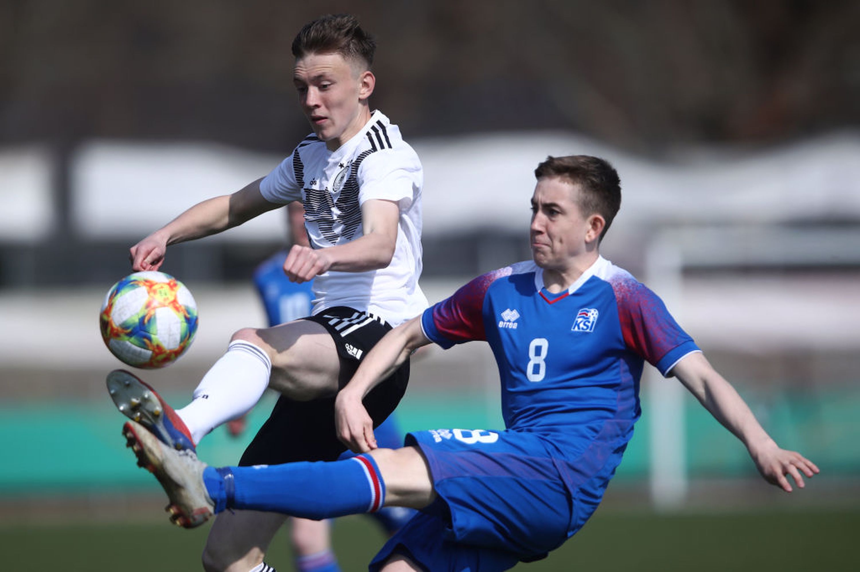 Ísak Bergmann Jóhannesson in azione con l'Islanda