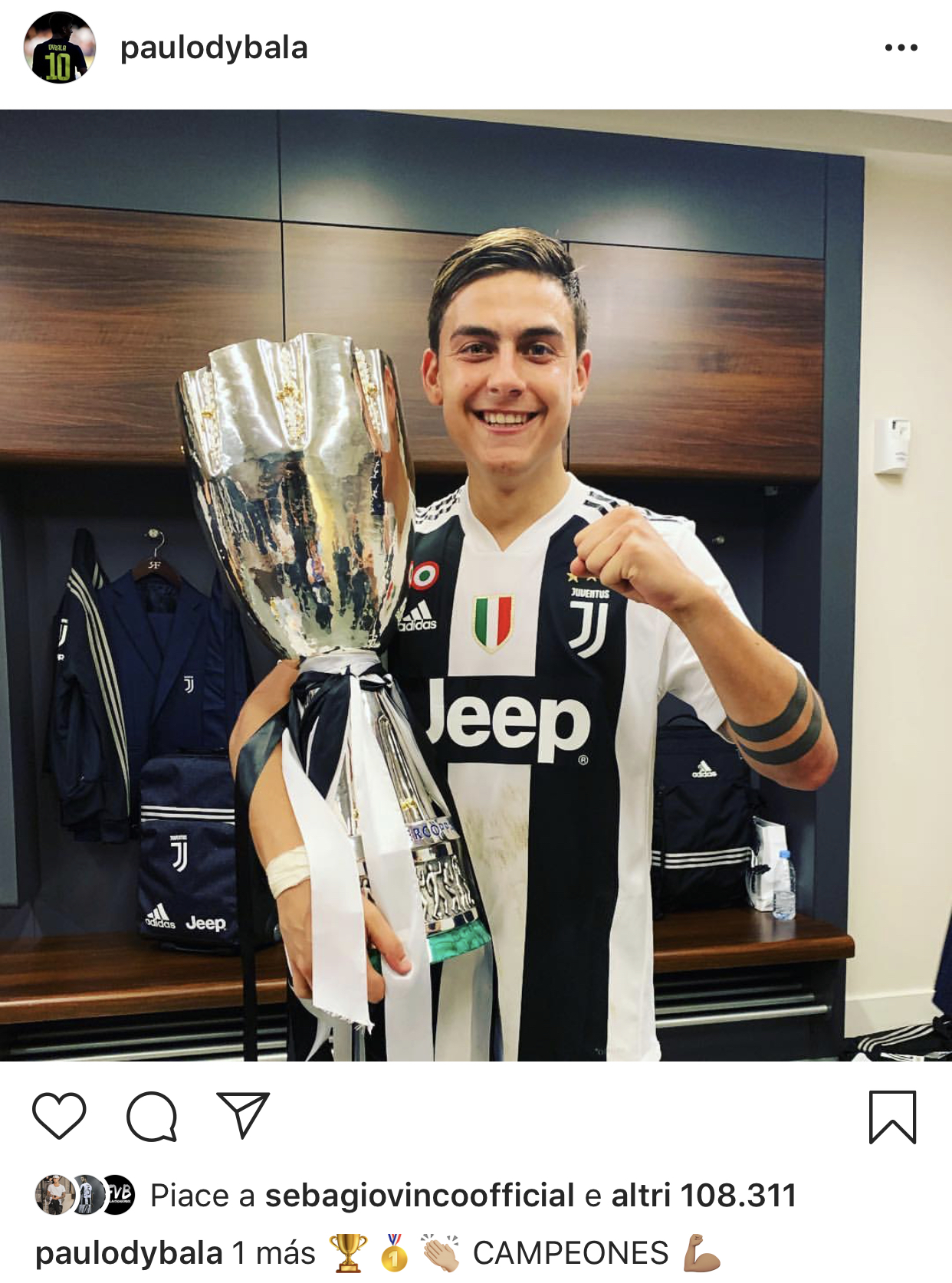 Paulo Dybala è stato il primo giocatore bianconero a postare una sua foto con la Supercoppa Italiana in braccio su Instagram dove l’argentino si è mostrato