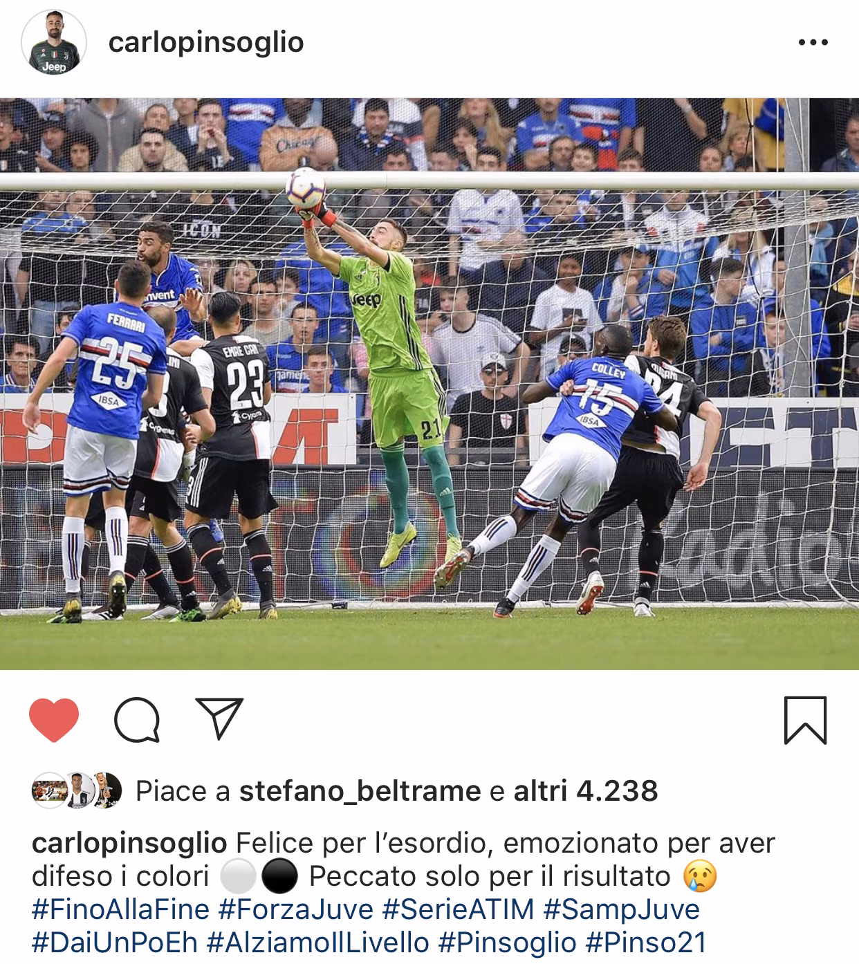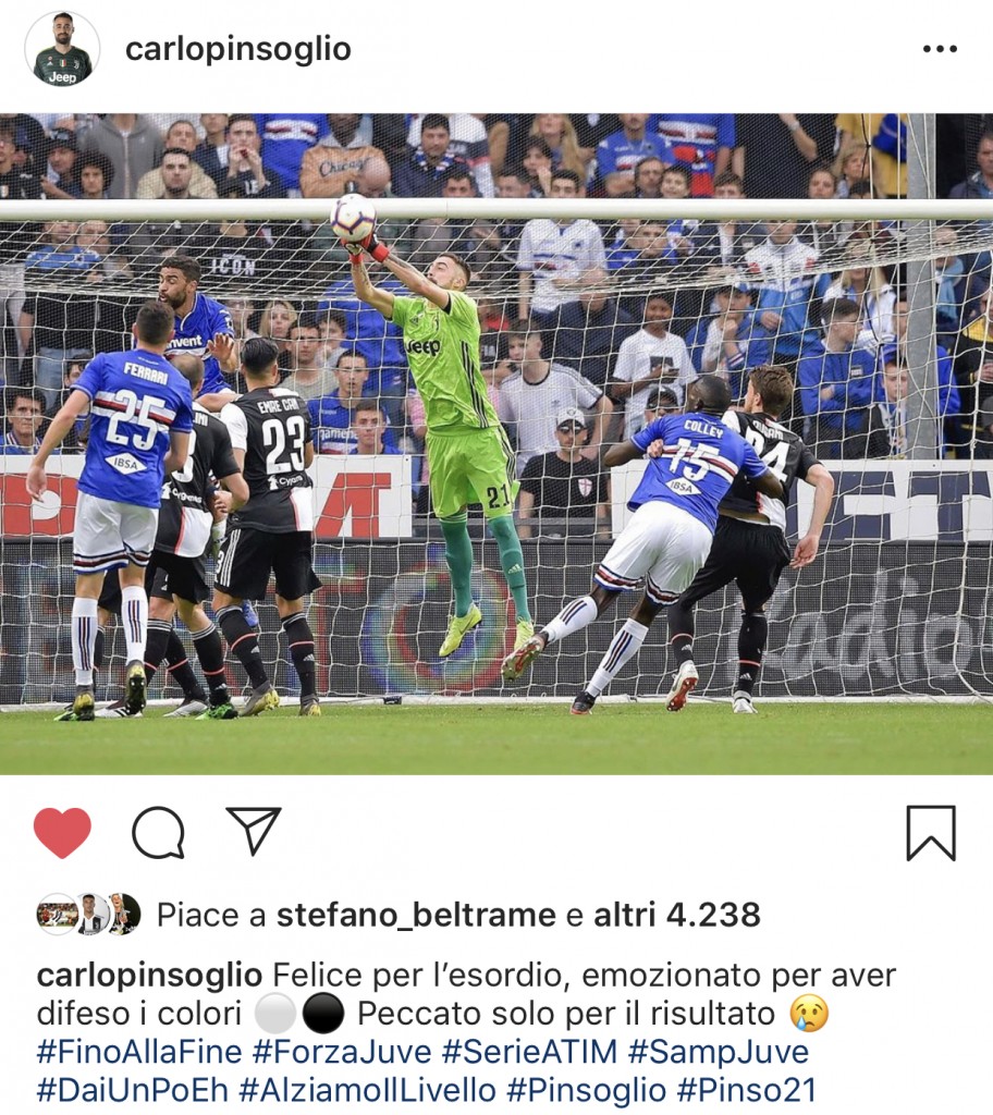 Carlo Pinsoglio, terzo portiere bianconero che quest’oggi ha vissuto il proprio esordio stagionale a Marassi, ha voluto condividere la sua emozione coi propri sostenitori, sul noto social network Instagram dove ha postato una foto del match odierno commentandola in questo modo: “Felice per l’esordio, emozionato per aver difeso i colori bianconeri. Peccato solo per il risultato”.