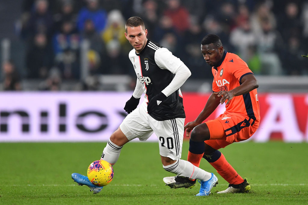 TURIN, ITALY - JANUARY 15: Marko Pjaca of Juventus with Nicholas Opoku of Udinese Calcio during the Coppa Italia match between Juventus and Udinese Calcio at Allianz Stadium on January 15, 2020 in Turin, Italy. (Photo by Valerio Pennicino - Juventus FC/Juventus FC via Getty Images)