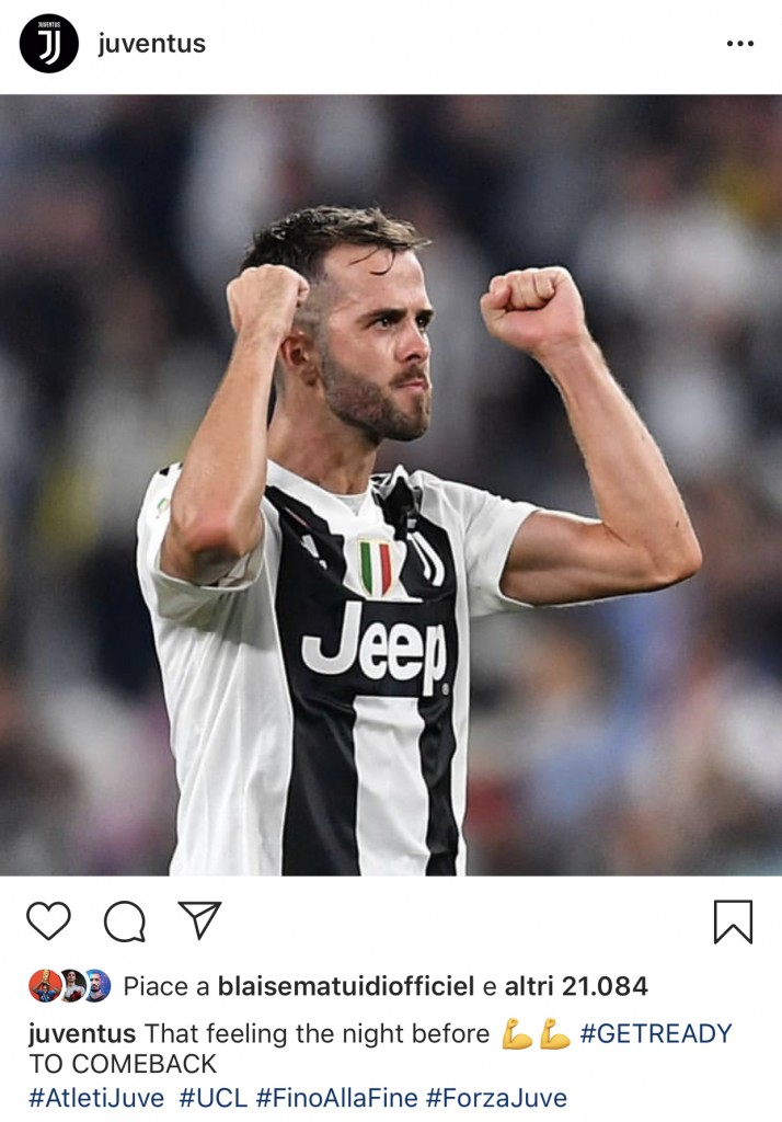 Il centrocampista Miralem Pjanic ha voluto dare la carica a tutto il mondo bianconero con un post che lo ritrae coi pugni chiusi durante i festeggiamenti di una rete e commentando la foto in questo modo: