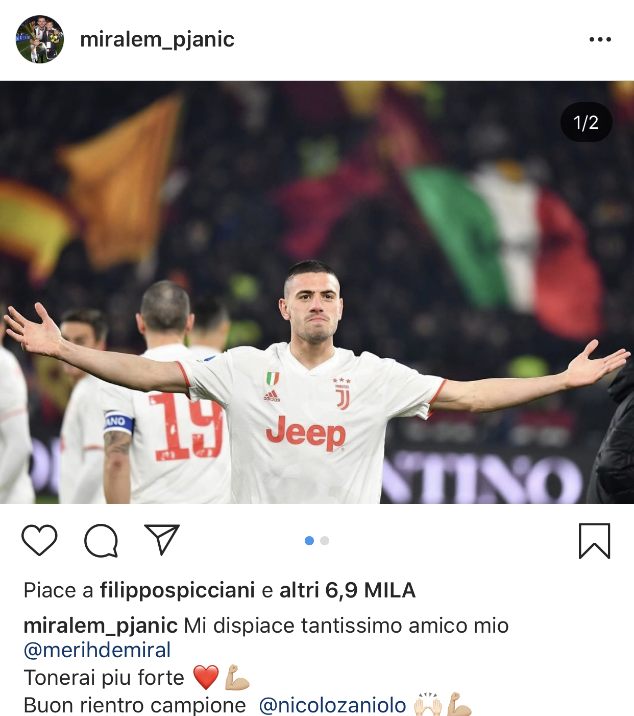 Miralem Pjanic si dimostra sempre molto attivo sui propri canali social ed in particolare su Instagram dove pochissimi minuti fa ha postato una foto di Demiral esultante dopo la rete che questa sera ha sbloccato la sfida dell’Olimpico dopo tre minuti commentandola in questo modo: “Mi dispiace tantissimo amico mio Merih Demiral, tornerai più forte! Buon rientro campione Nicolò Zaniolo”. Il centrocampista bosnica, ex giallorosso, ha dimostrato così la sua vicinanza sia al proprio compagno di squadra ma anche all’avversario che questa sera per il quale è stata confermata ufficialmente la rottura del legamento crociato anteriore del ginocchio destro. Per quanto riguarda invece il difensore bianconero, bisognerà attendere domani, quando verrà sottoposto agli accertamenti strumentali, che definiranno l’infortunio subito.