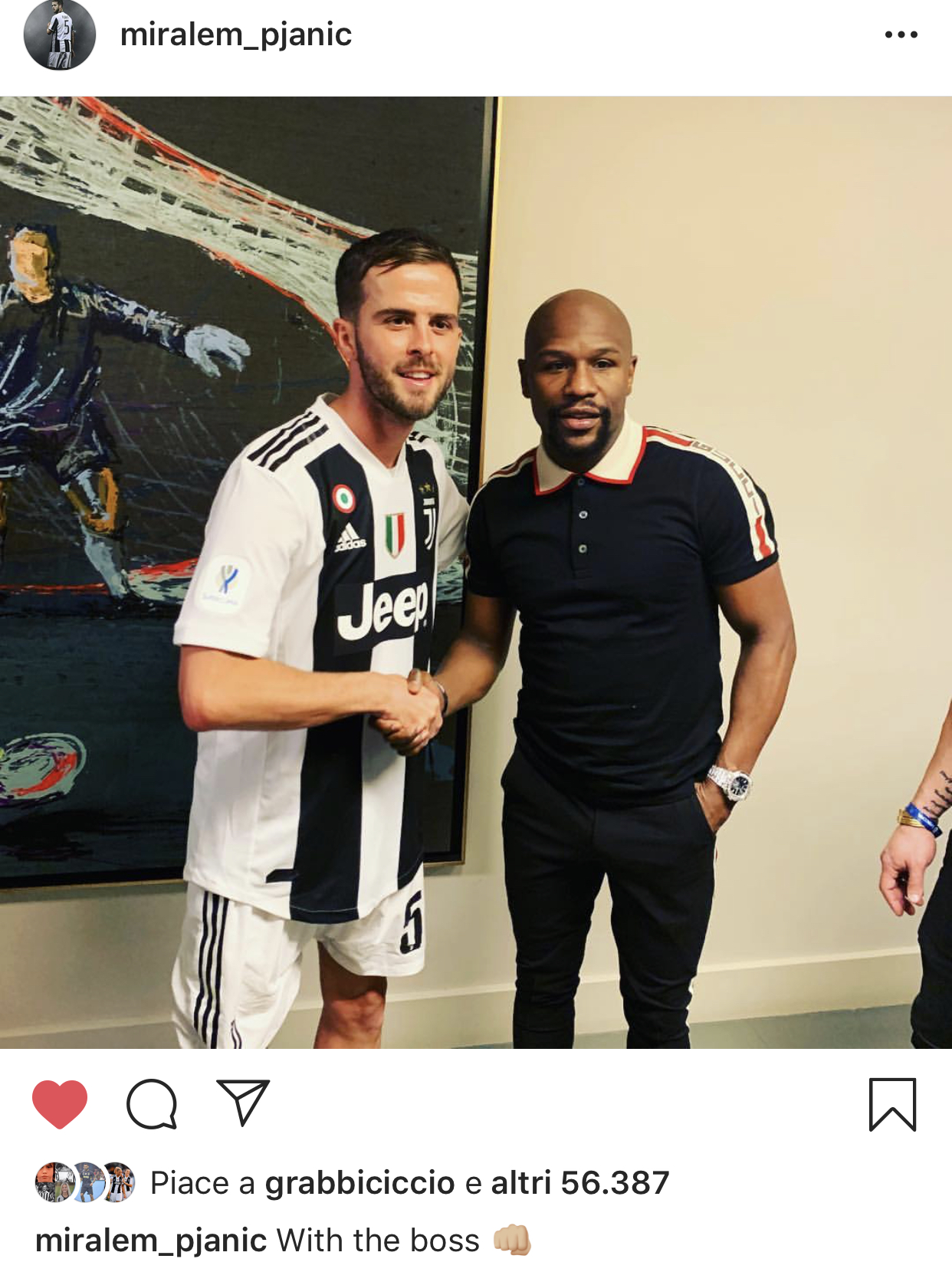 Miralem Pjanic ha postato pochi fa una foto che lo ritrae in compagni del campionissimo di pugilato Floy Mayweather che questa sera ha assistito dagli spalti