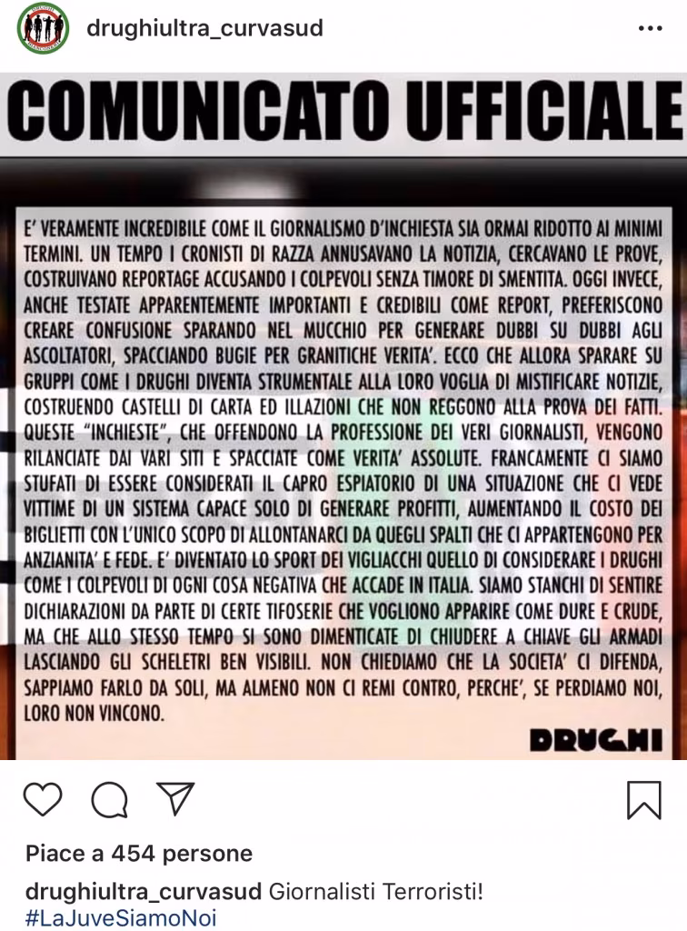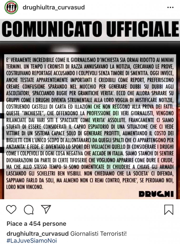 Il gruppo organizzato di tifosi bianconeri “Drughi” ha da poco diramato un comunicato ufficiale sul proprio profilo ufficiale di Instagram.